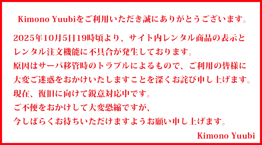 - A.Kimono Yuubiでは、担当のスタッフが発送前に一着一着すべての着物に対し、大きなシミや顕著な汚れがないかをチェックし、アイロンがけをし直して発送しています。 戻ってきた着物も同様にすべての箇所をチェックし、クリーニング、虫干し、アイロンがけを行って湿気のない場所で保管しております。 しかし中には、軽度のシミ汚れや劣化が見られるものもある可能性がございますが、あくまで多くが新品商品ではございませんので、あらかじめご同意いただいた上でご利用いただけますようお願い申し上げます。 ※基本的には、定期的な検品により、汚損・破損が顕著な商品はサイト掲載を控えておりますので、どうぞ安心してご利用ください。