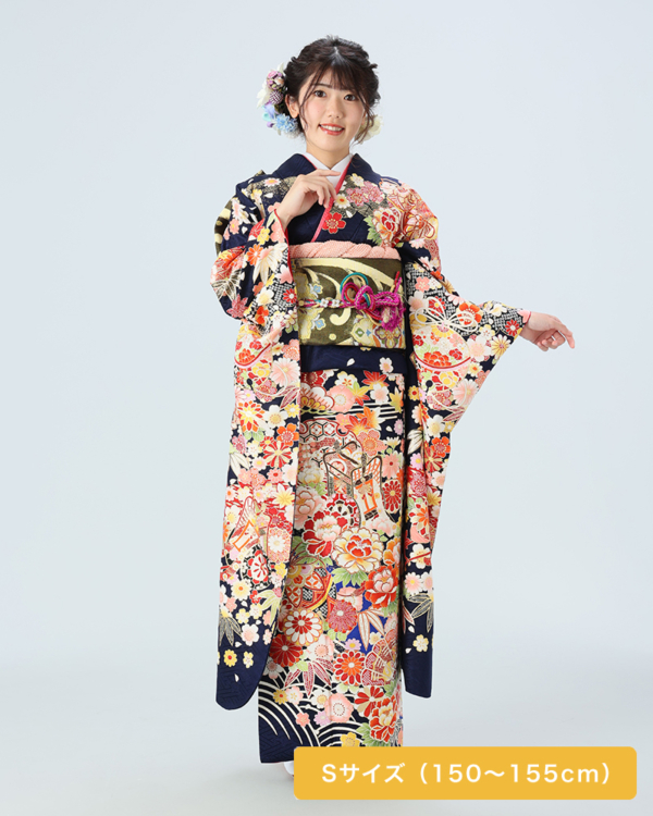 紺地に鼓とカラフルな花紋でレトロポップな1着に