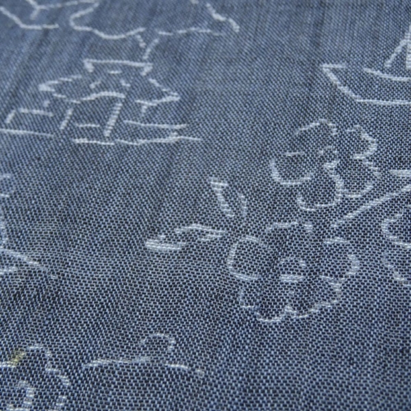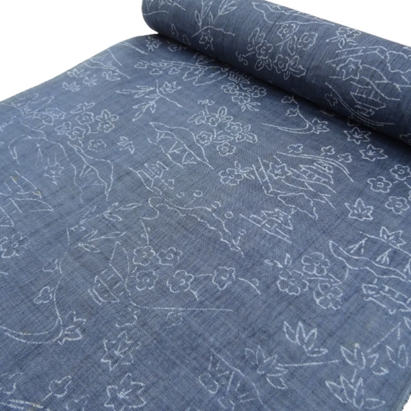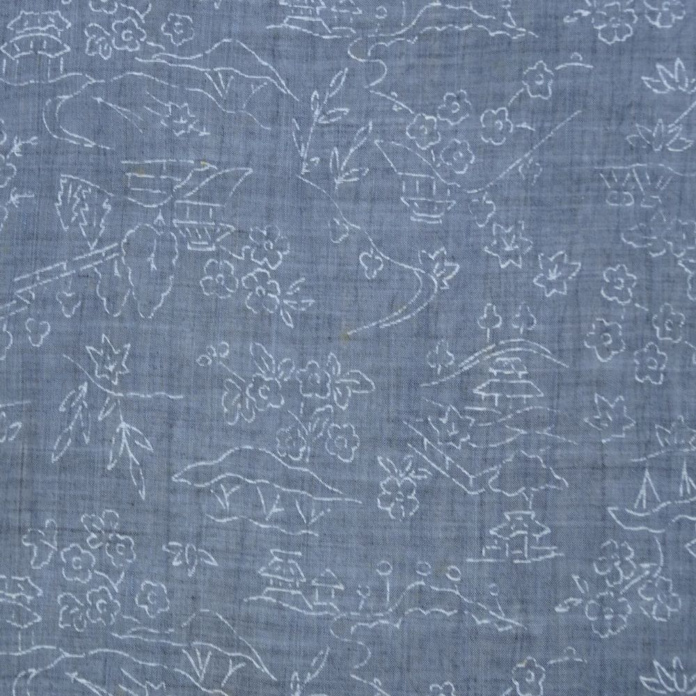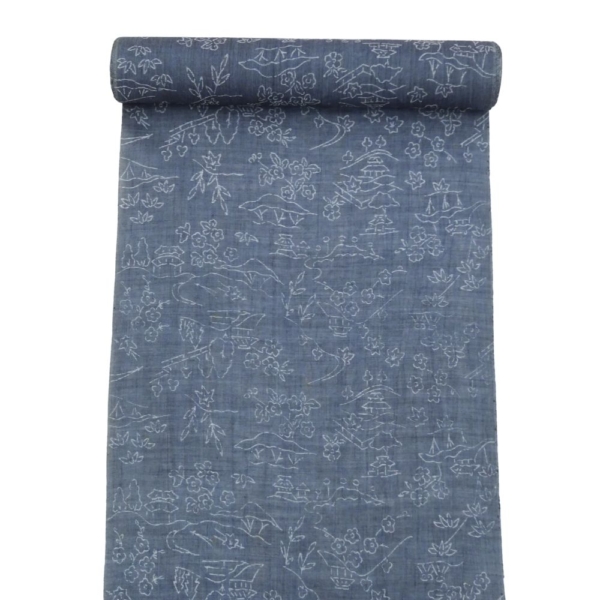 麻反物 リユース 藍色 山水風景模様 004-8s(8050-00252) 着尺 夏着物 リメイク素材に