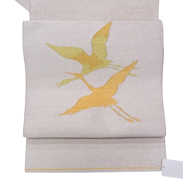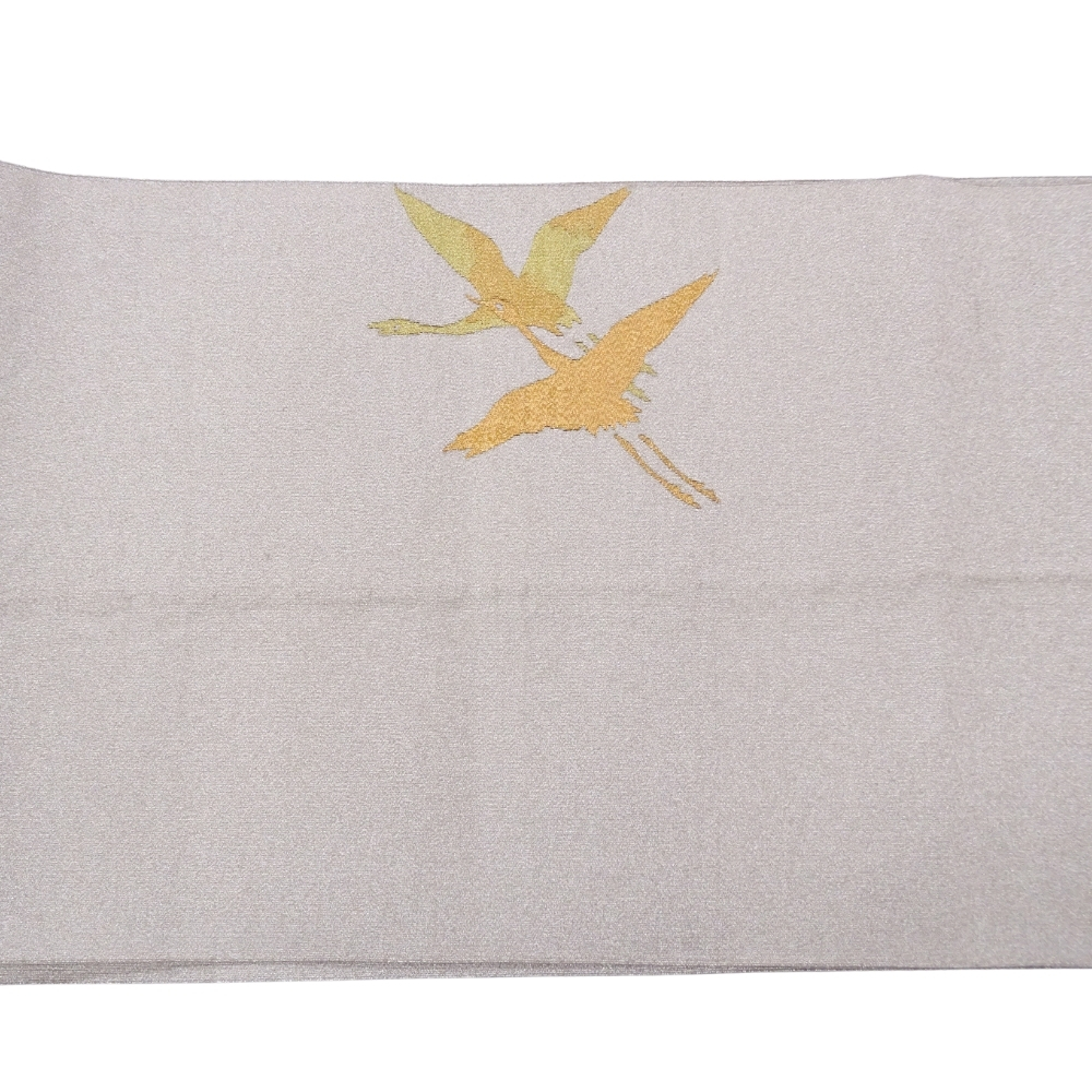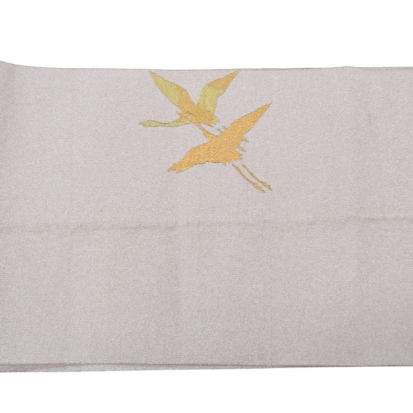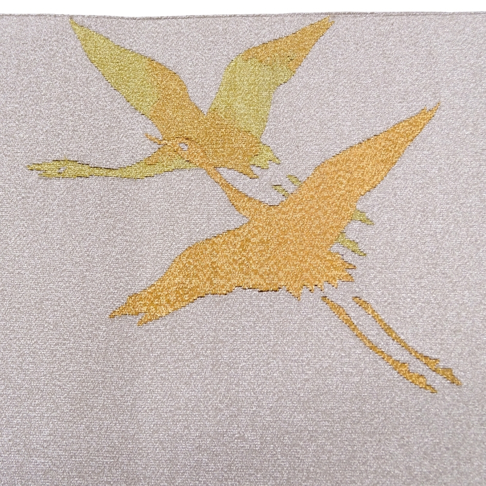 シルバーに、金色と黄色の糸で二羽の鶴が織り出された、上品な雰囲気の爪搔き本綴れ袋帯です。