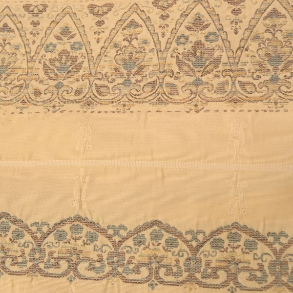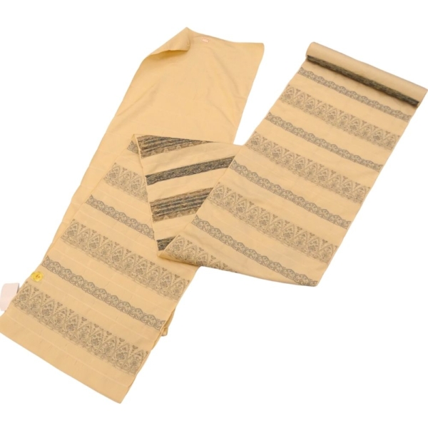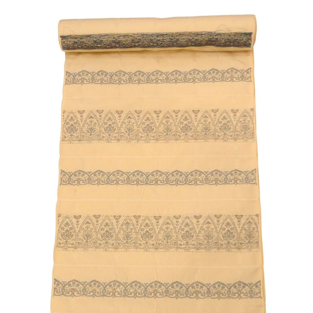 上品な淡いベージュの地に、繊細なタッチで描かれた華紋と唐草の横段文様が美しい、名古屋帯の反物(未仕立て)です。