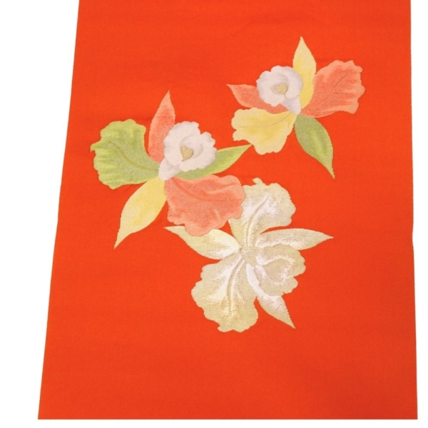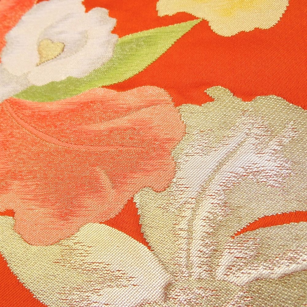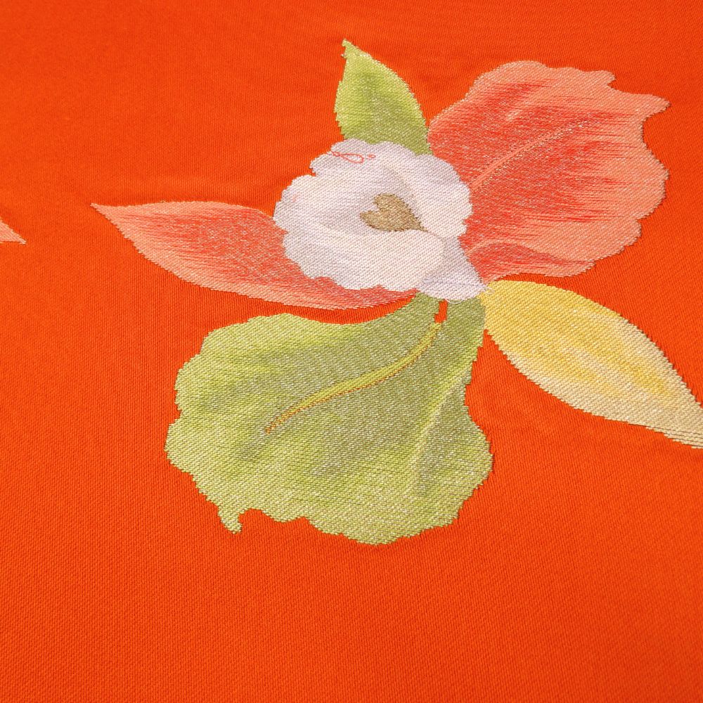 名古屋帯反物 正絹 リユース 未仕立て 中古 朱色 洋蘭 カトレア 006-2(8050-00281)