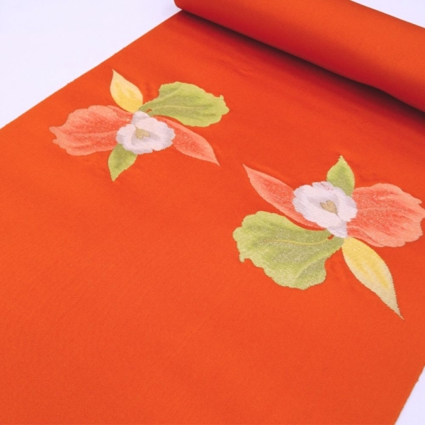 ハッと目を引く鮮やかな朱色の地に、大輪の蘭が大胆に配された名古屋帯の反物(未仕立て)です。