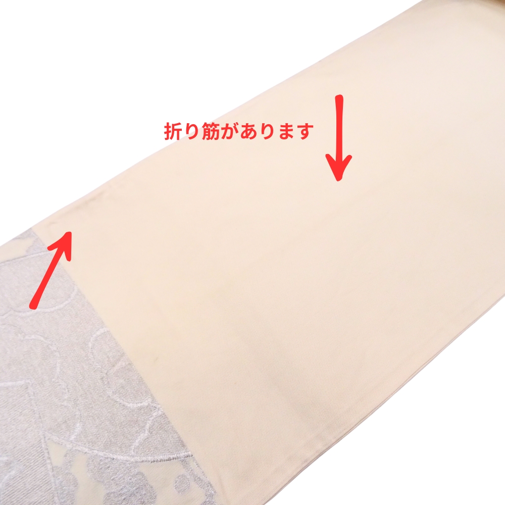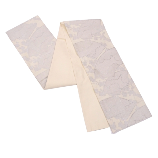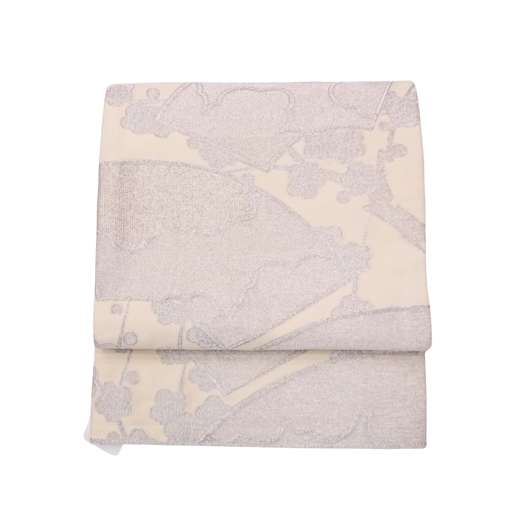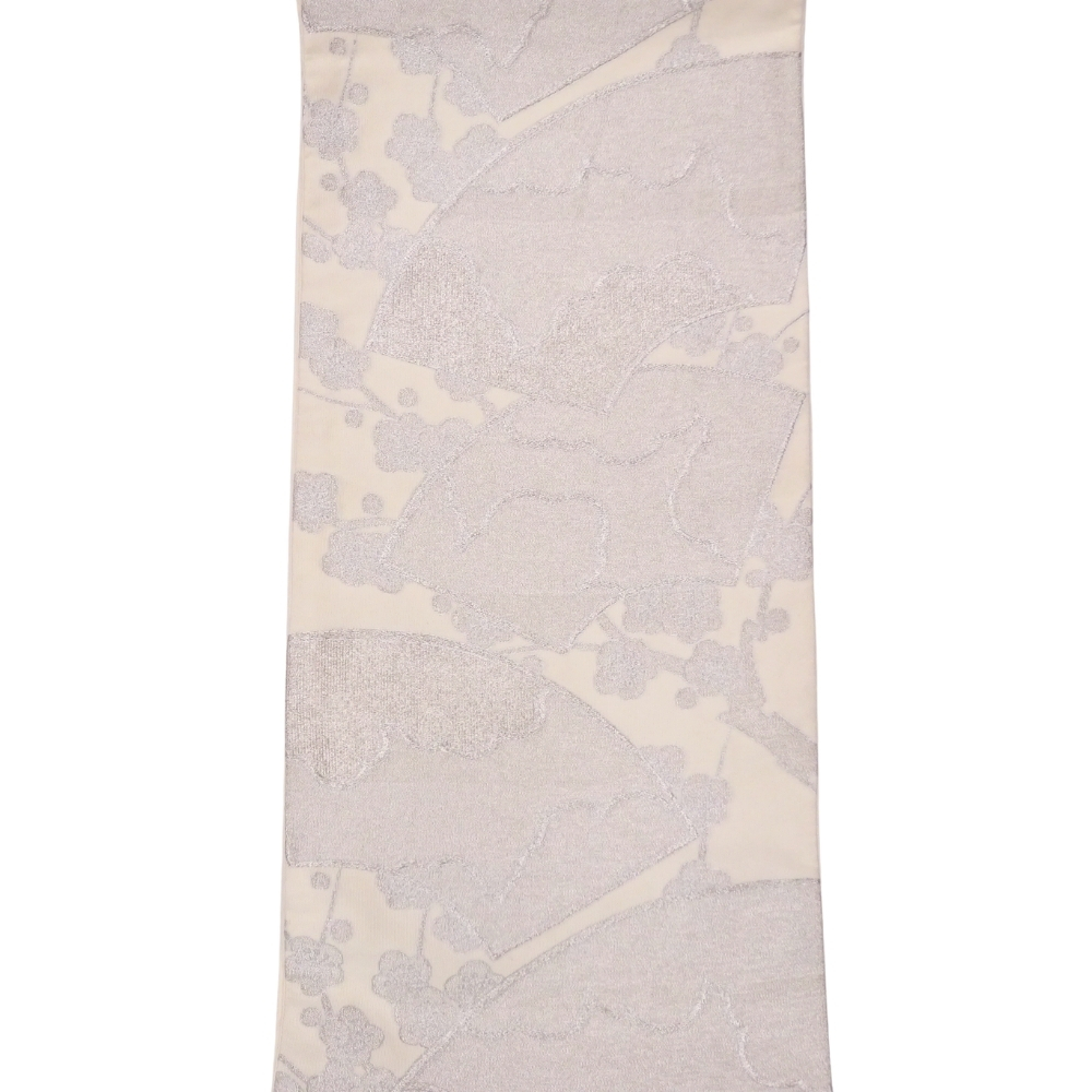 クリームがかったオフホワイトの地に、銀糸と白銀の織りで扇面文様と梅文様が表現された、格調高い礼装用袋帯です。