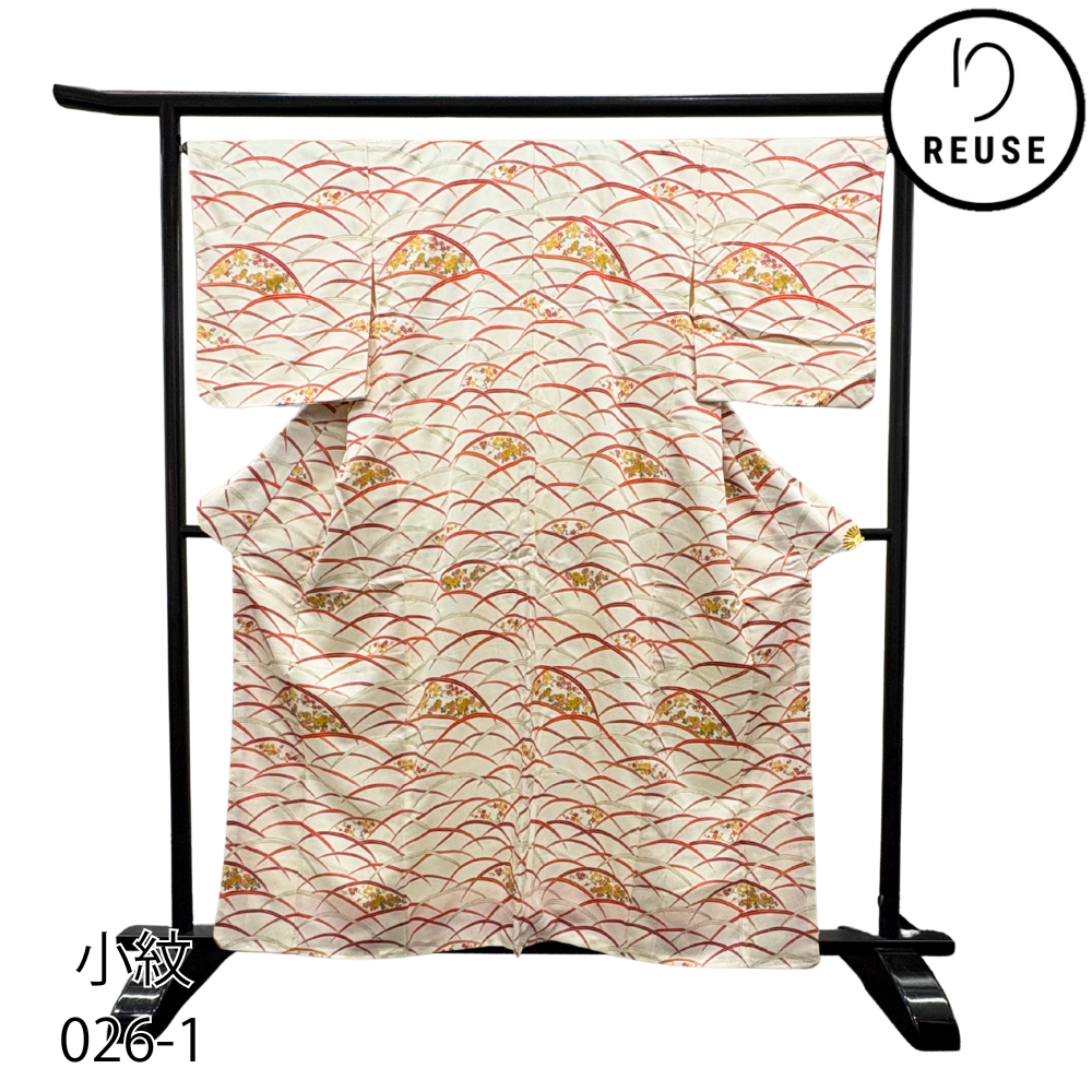小紋 袷 正絹 リユース 中古 露芝に小花柄 クリーム地 026-1R(8050-00361)