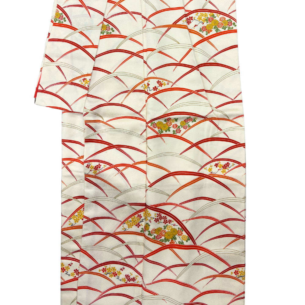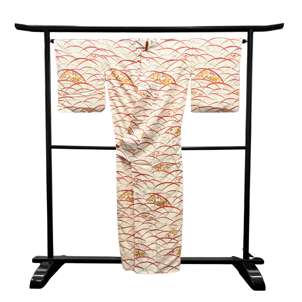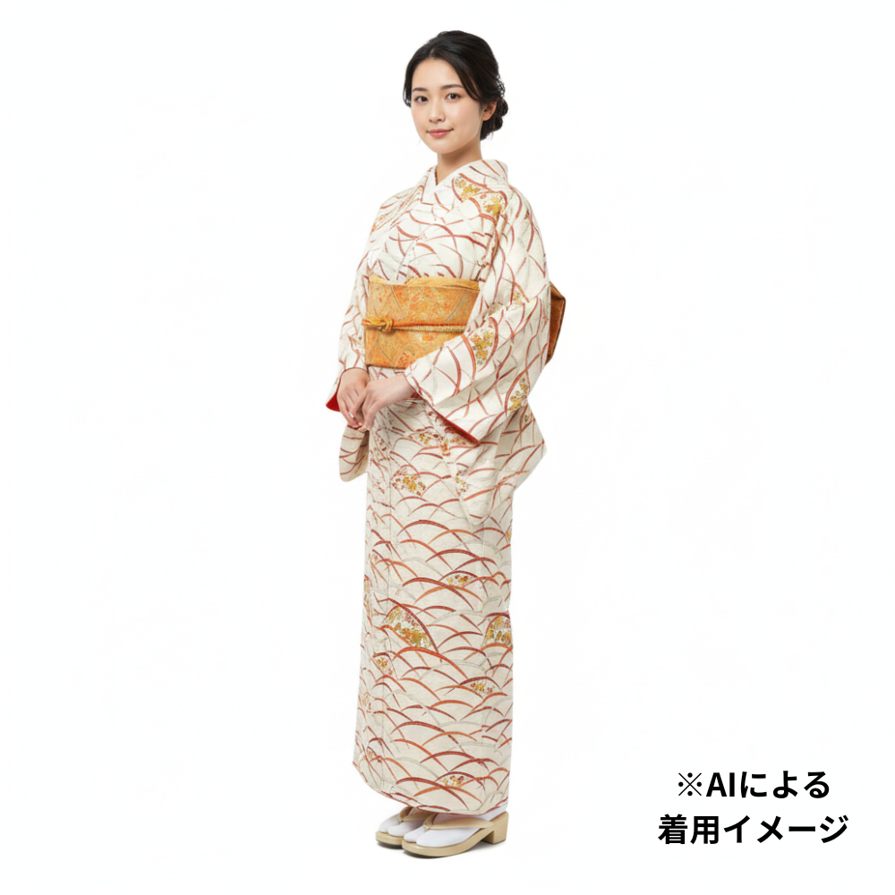 優しいアイボリー系の白地に、赤い露芝の模様が印象的な小紋の袷着物です。