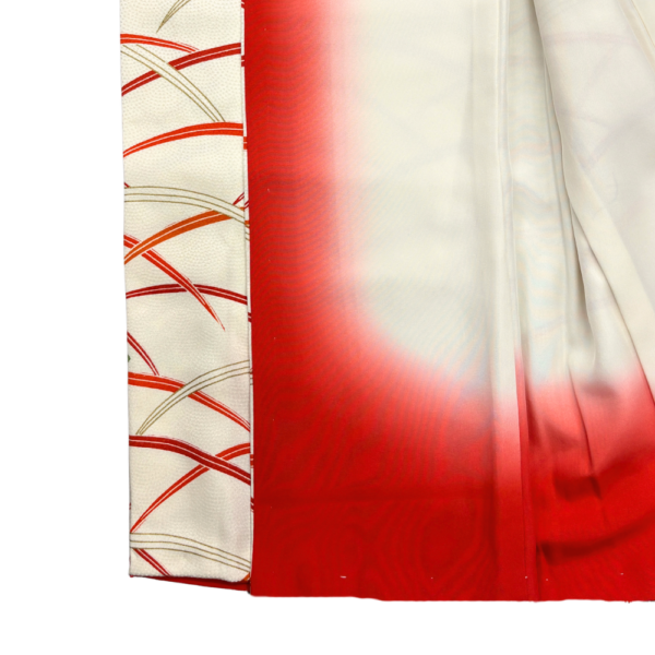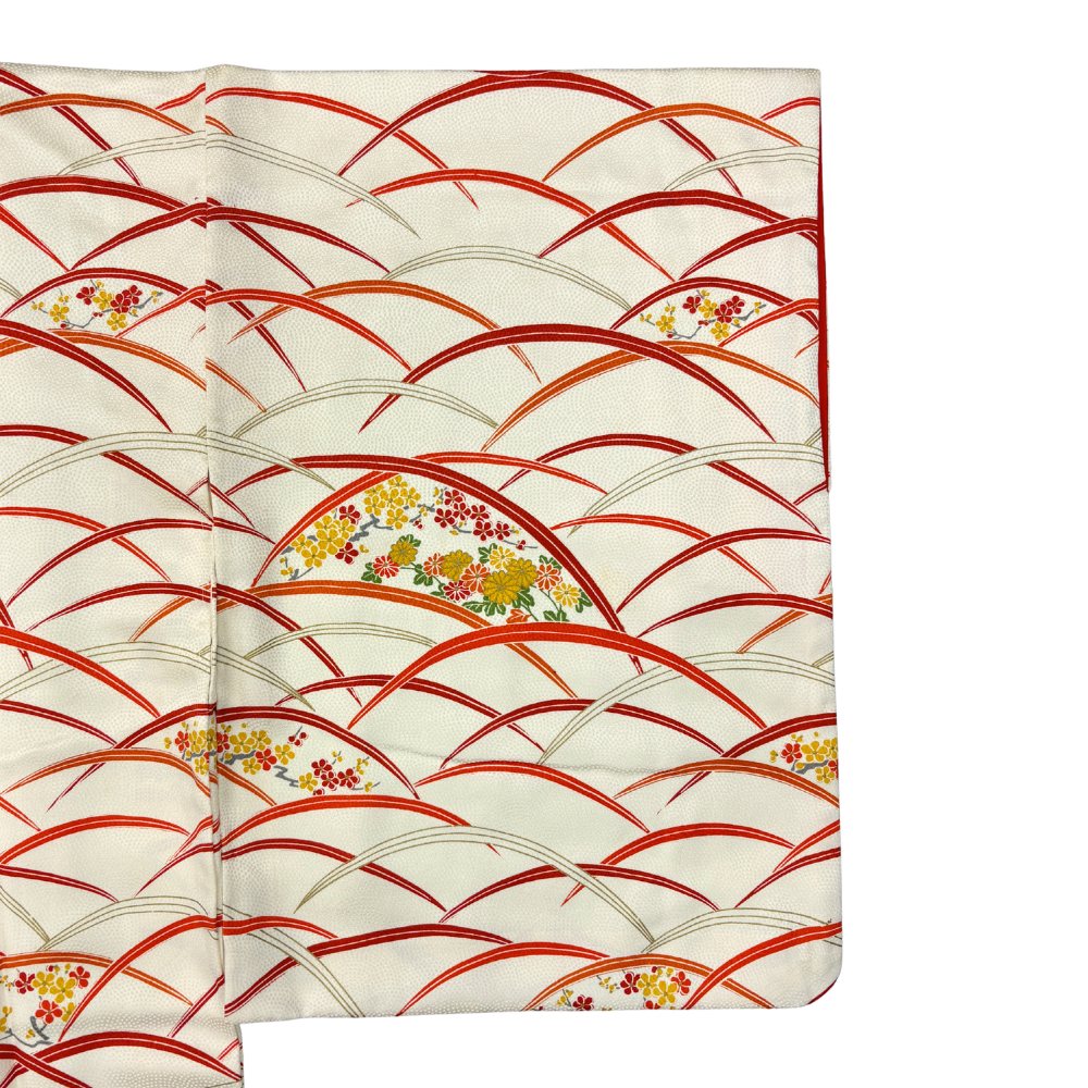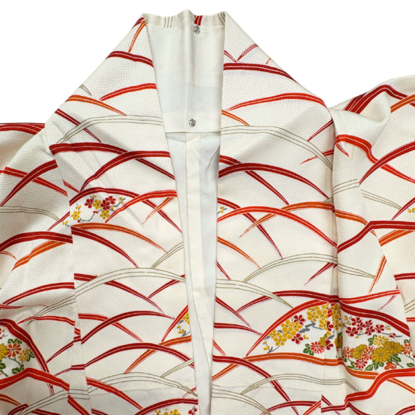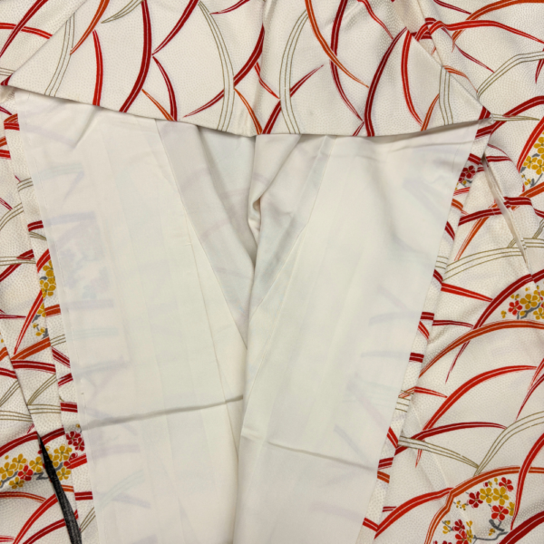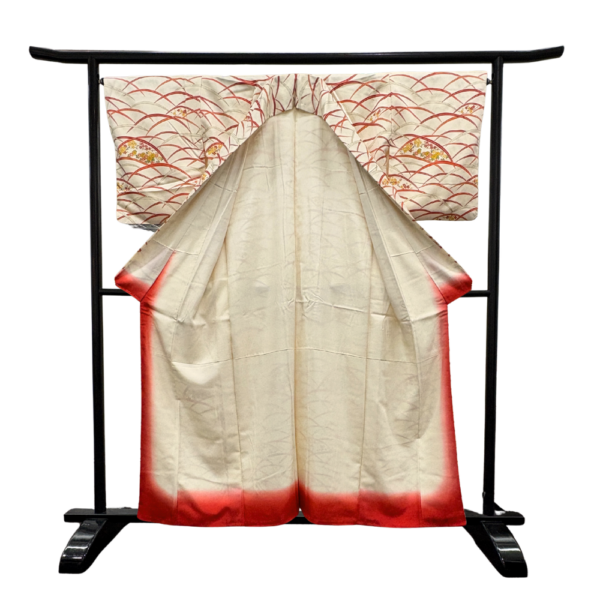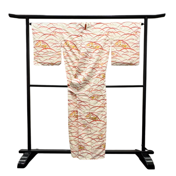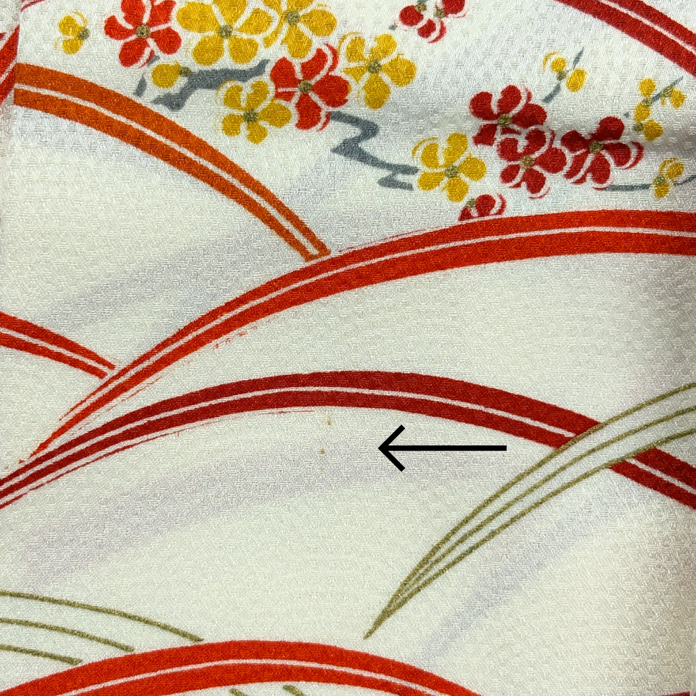 優しいアイボリー系の白地に、赤い露芝の模様が印象的な小紋の袷着物です。