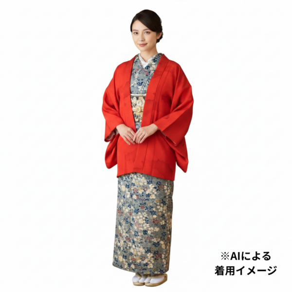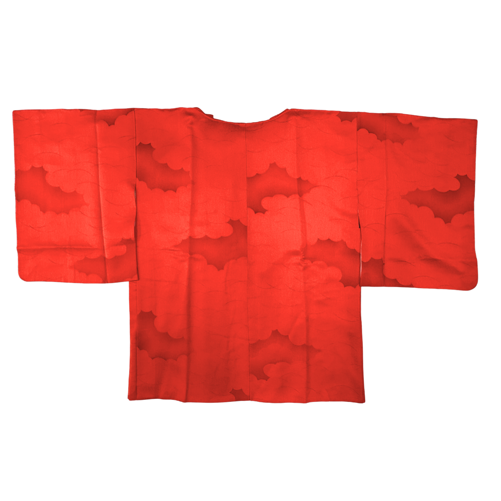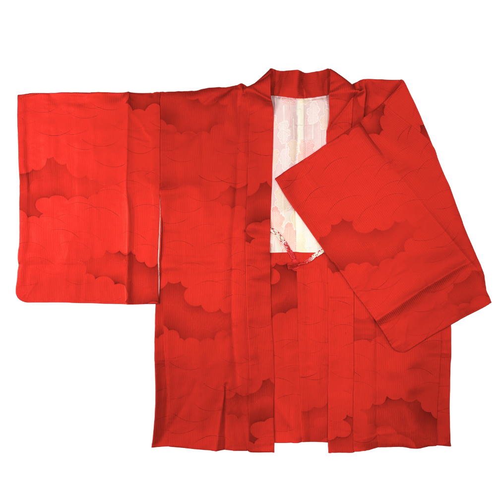目を引く鮮やかな赤色に、濃淡で表現された雲柄が映えるアンティーク調の羽織です。