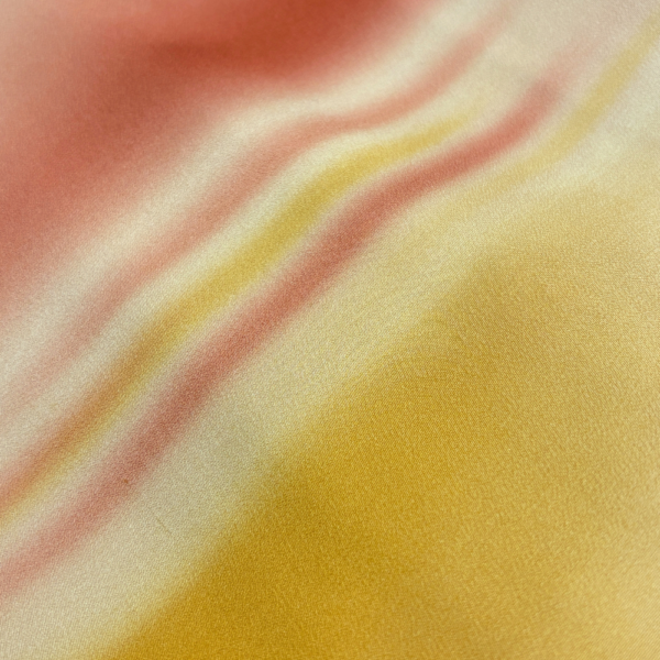 オレンジ、イエロー、そしてほのかな赤が溶け合うような横縞の染めが、まるで夕焼け空のような幻想的な雰囲気を持っています。