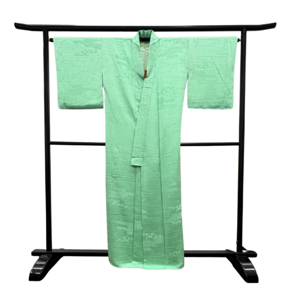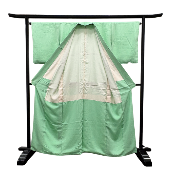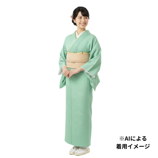 爽やかで上品なミントグリーンの地色が目を引くバチ衿仕立ての色無地着物です。