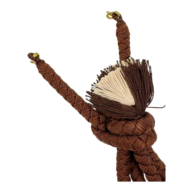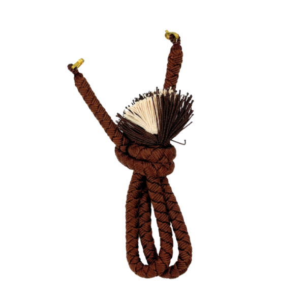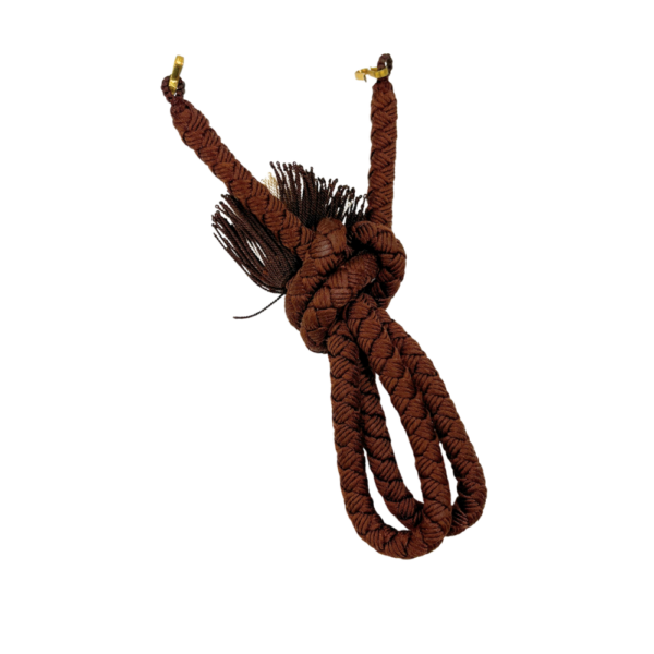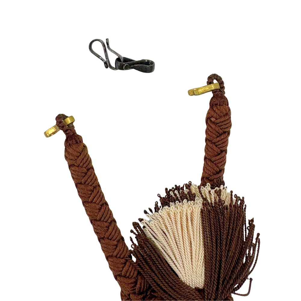 こちらはしっかりとした丸組の紐と、紐の結び目から広がる焦げ茶色とベージュのバイカラー房が特徴的です。