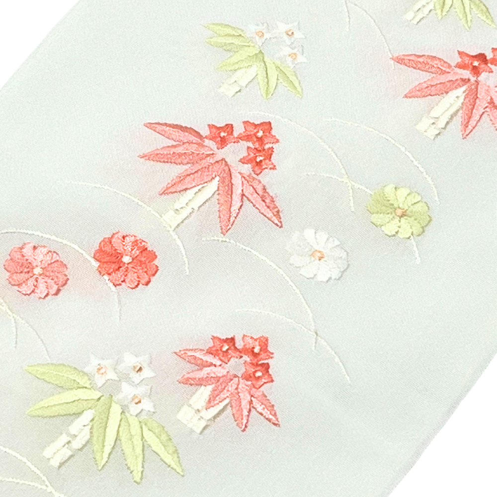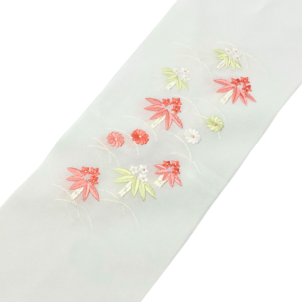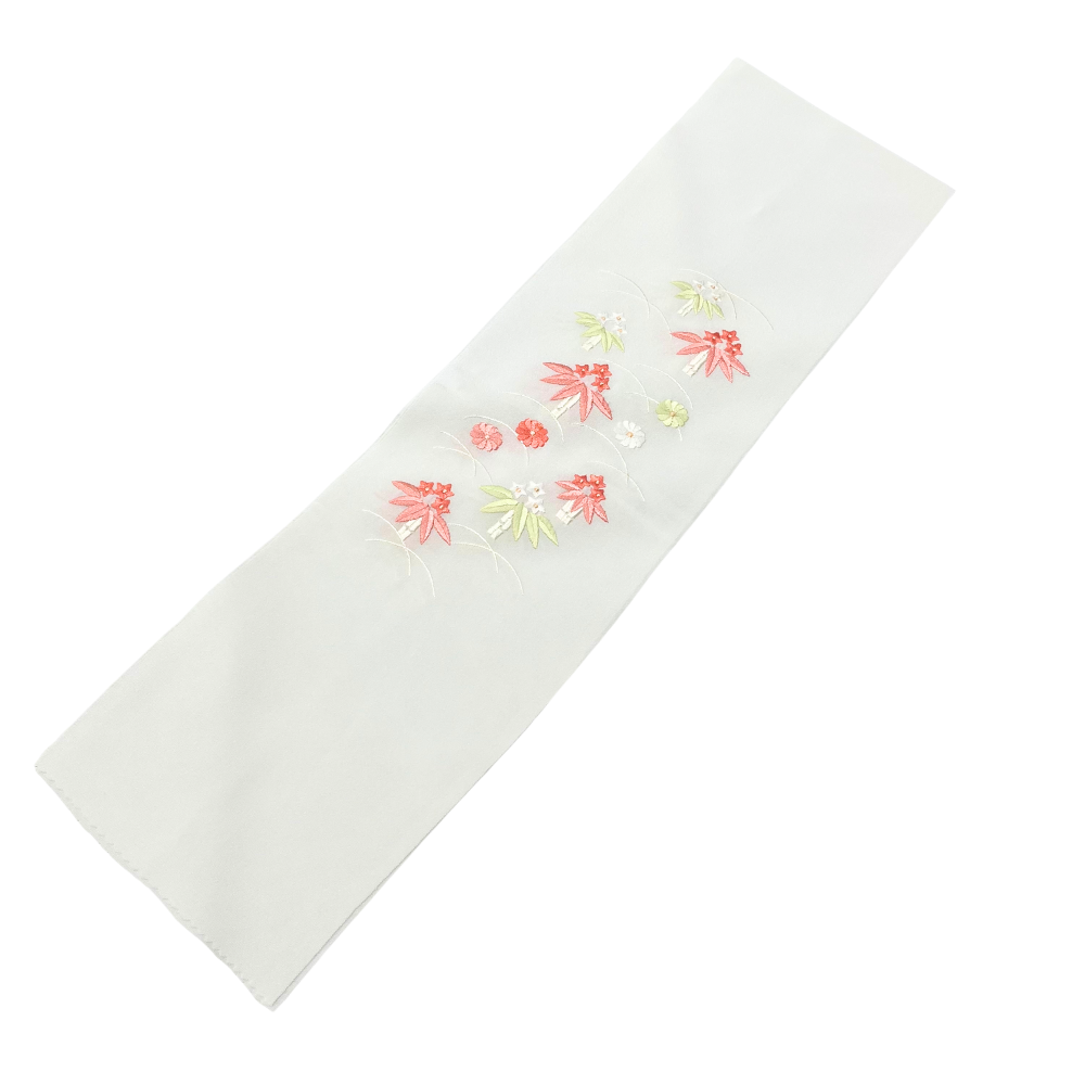 白の絹交織生地に、笹竹と可愛らしい小花を刺繍で表現した半衿です。