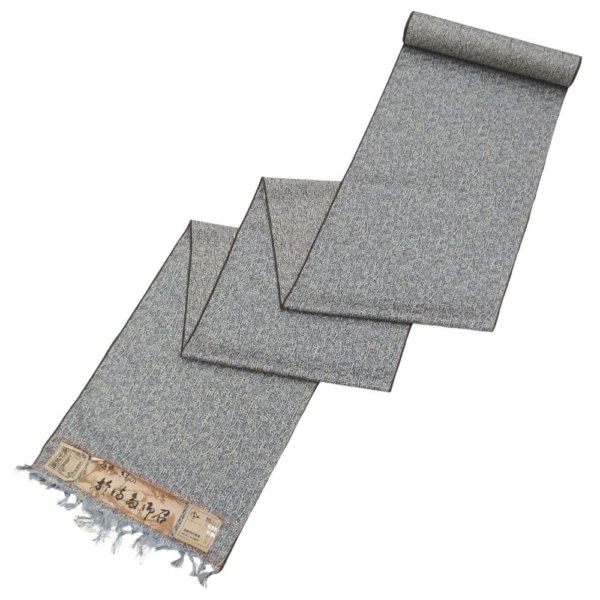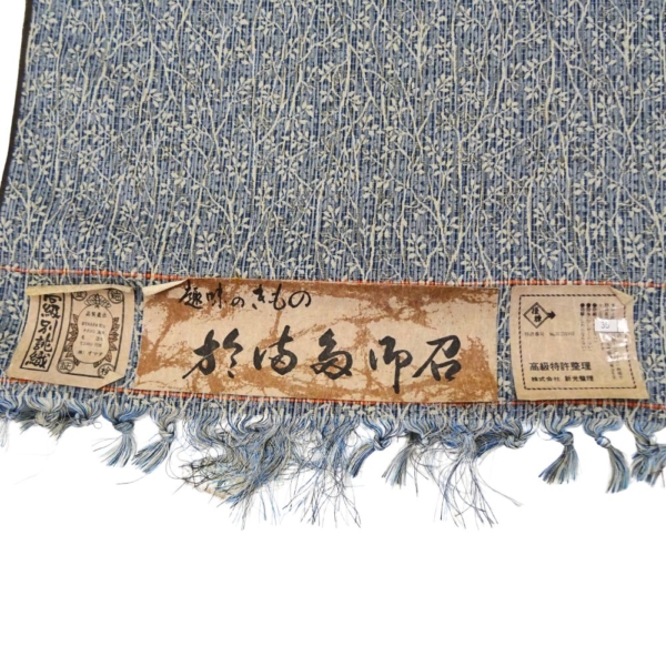 証紙が付いた確かな品質のお品で、落ち着いたブルーグレーの地に白抜きの繊細な草花が全面に広がっています。