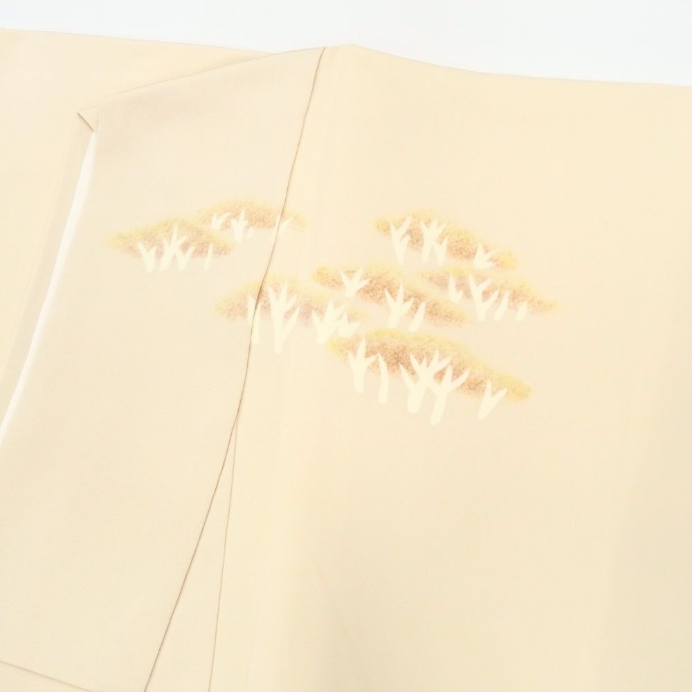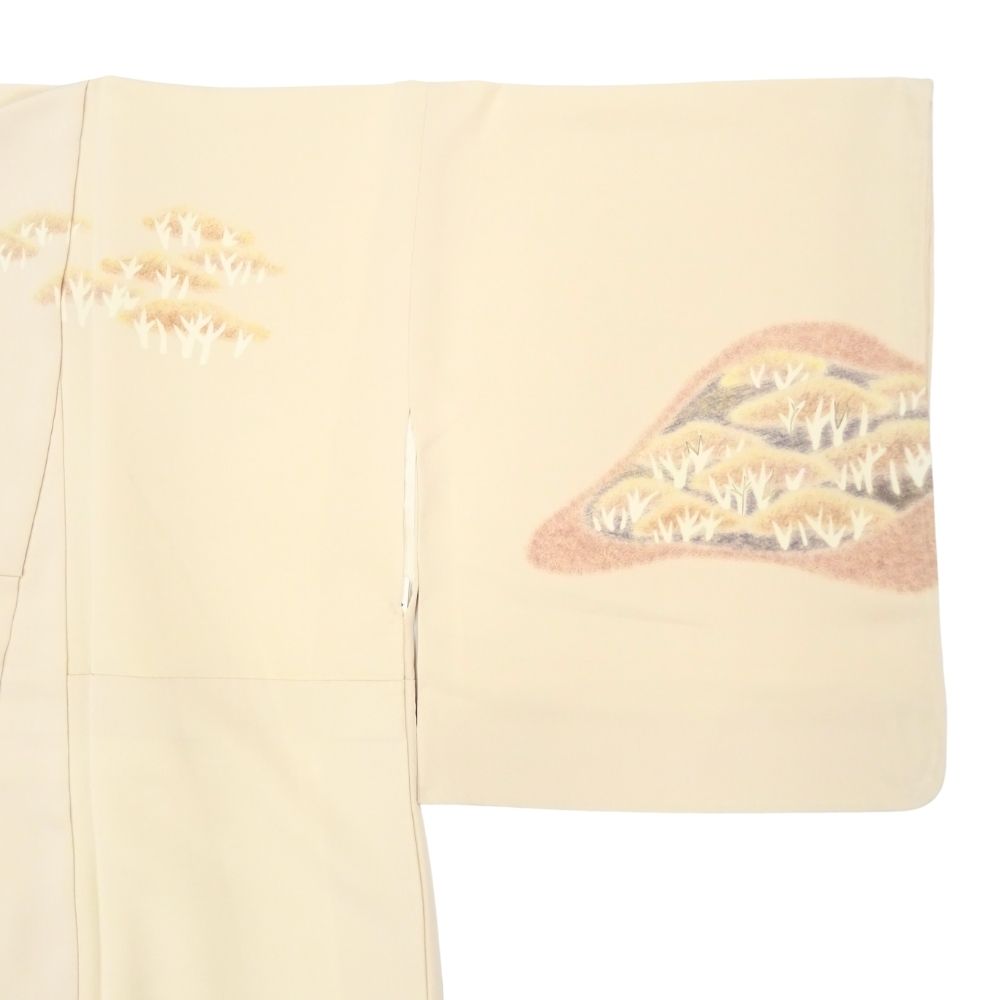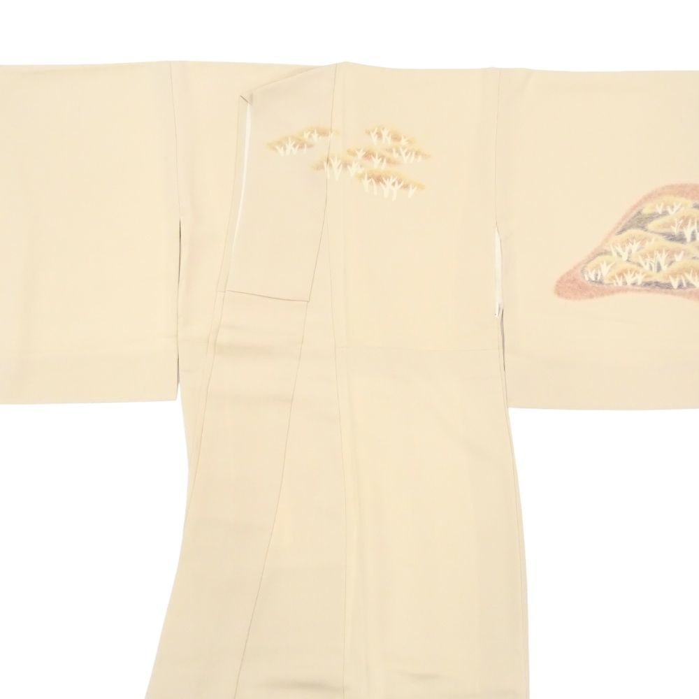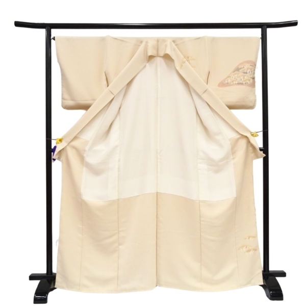 品の良い薄ベージュ色(アイボリーに近いベージュ)の地に、優しくも格調高い遠山文様が描かれた袷仕立ての訪問着です。