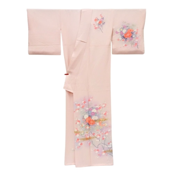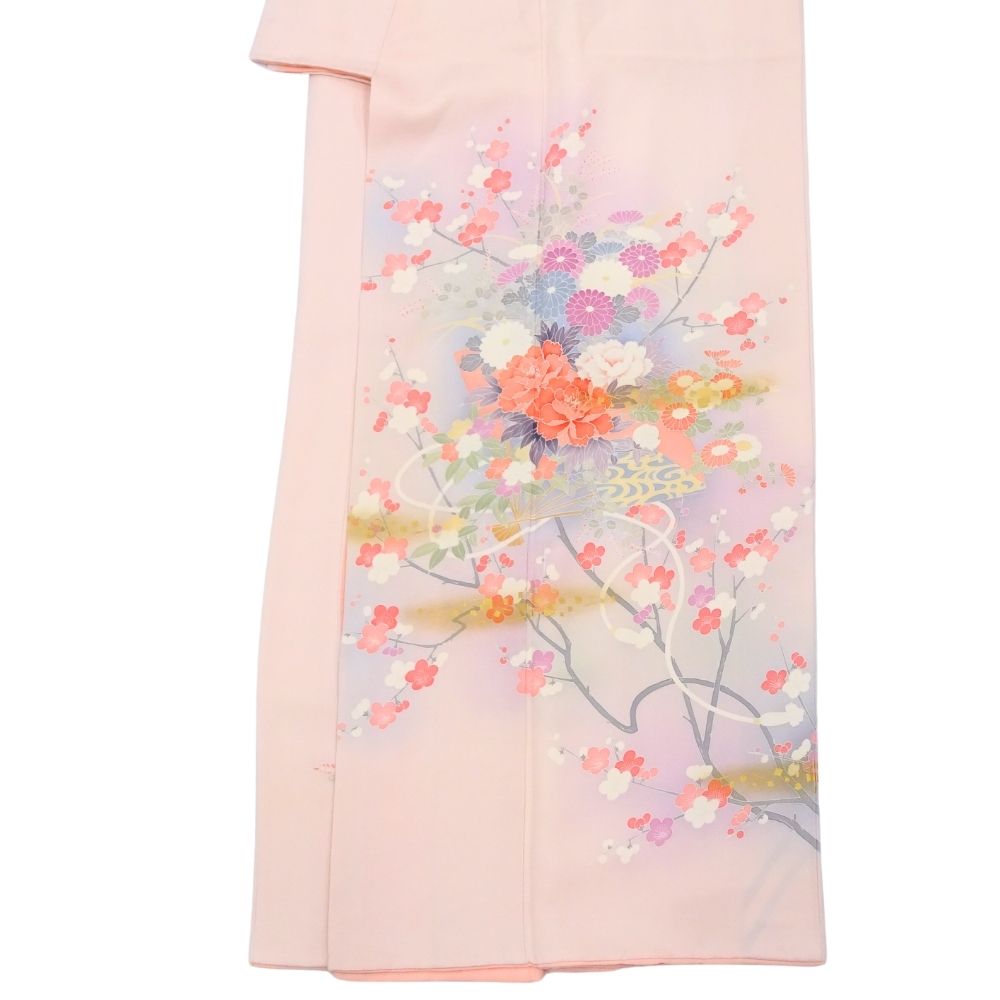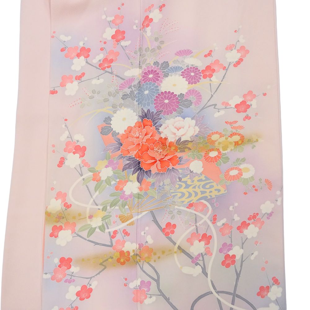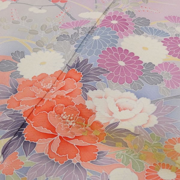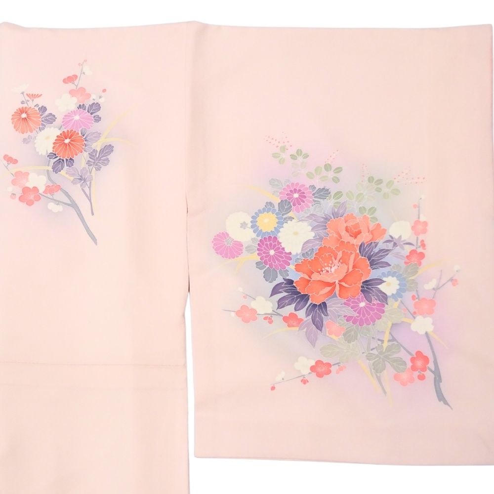 柄は、大きく華やかな牡丹を中心に、菊、梅、紅葉などの四季の草花が、手描き友禅風の繊細なぼかしと彩色で豊かに描かれています。