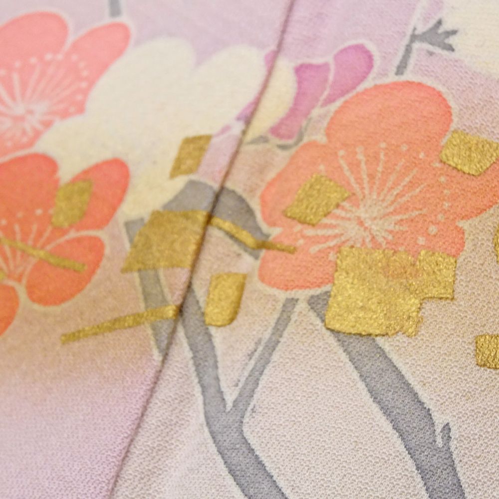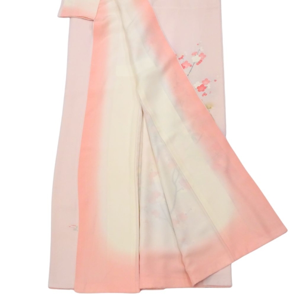 正絹の付下げです。付下げは訪問着に次ぐ略礼装として着用され、柄が縫い目で途切れないように配置されています。
