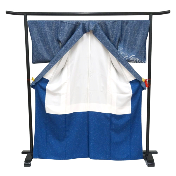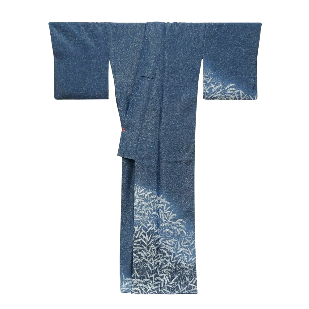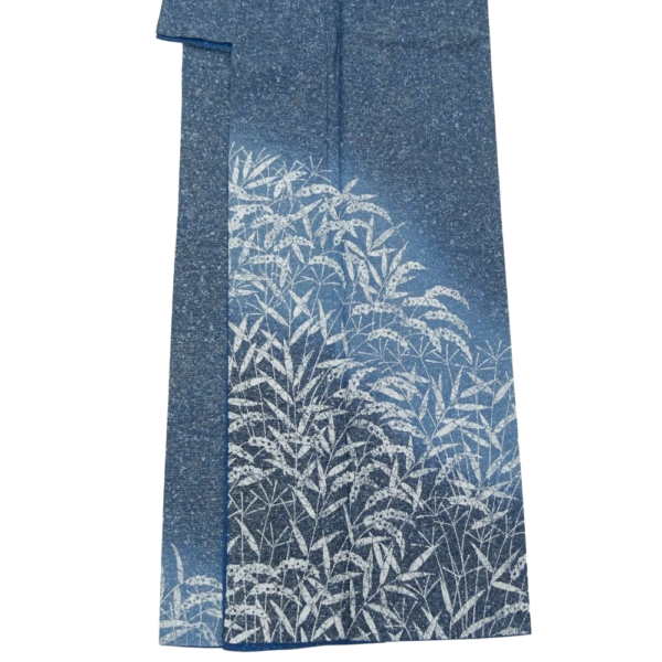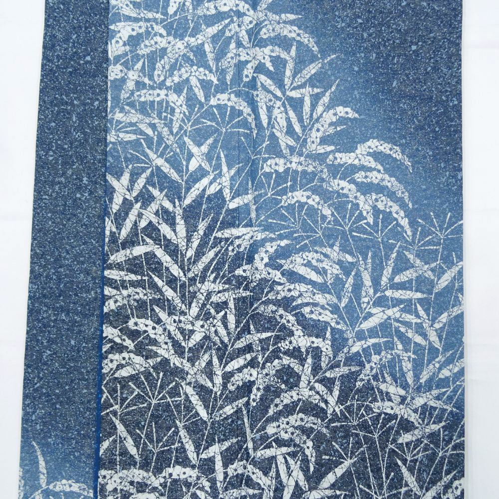 熱で溶かした蝋(ろう)を筆で布地に直接描いて染める臈纈染が用いられ、裾から袖にかけて、雪が積もったように白く表現された笹の葉の文様が描かれています。