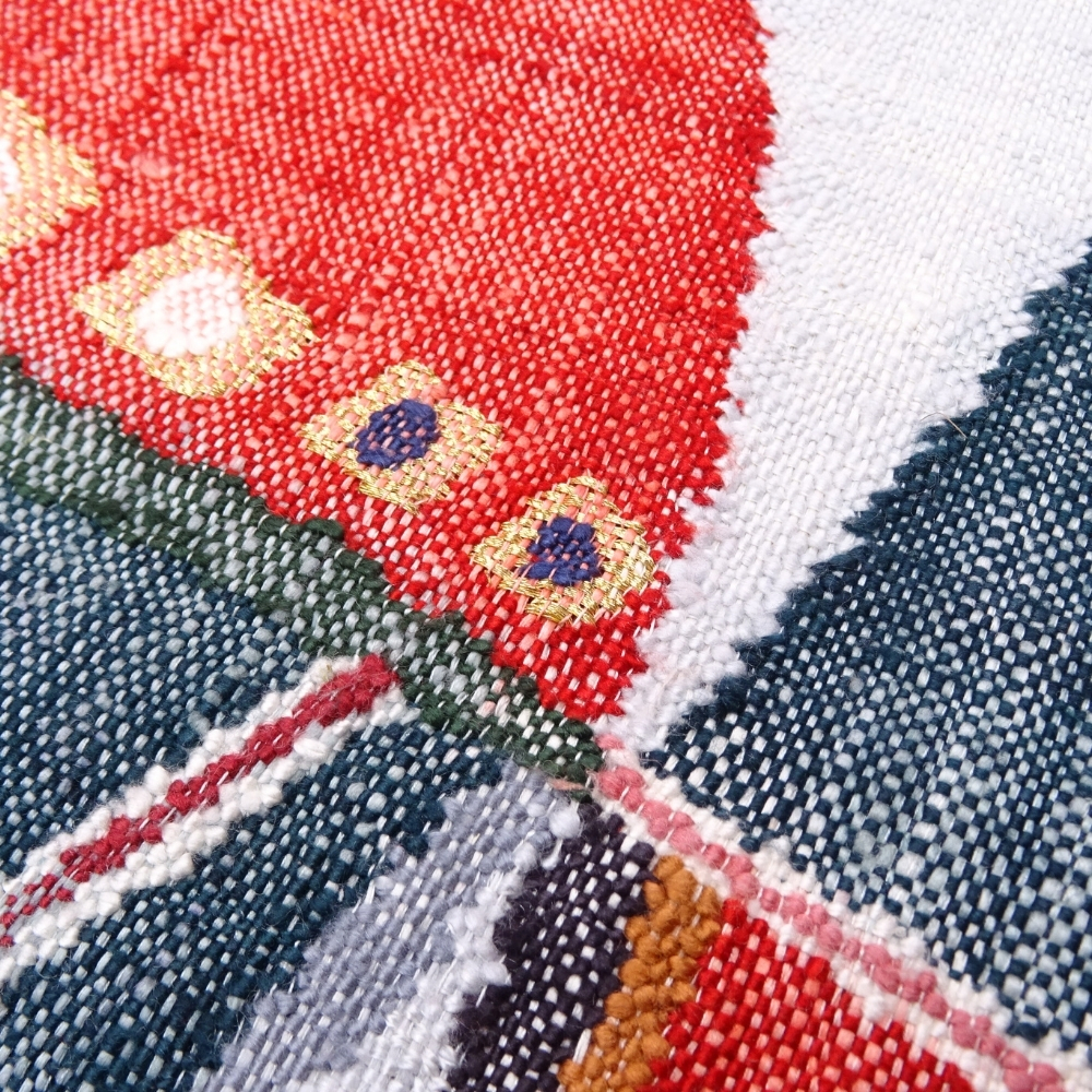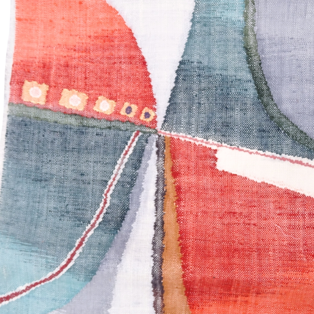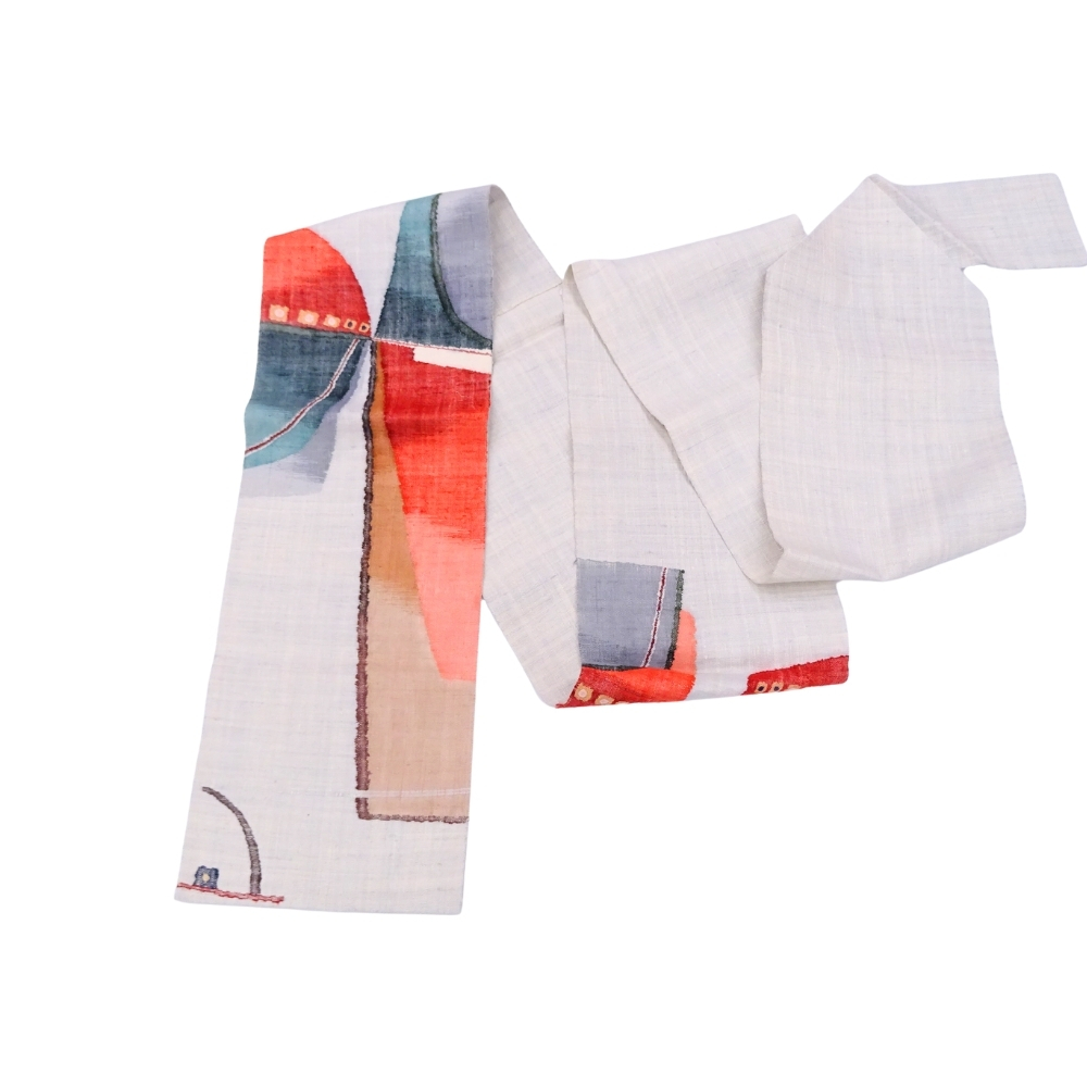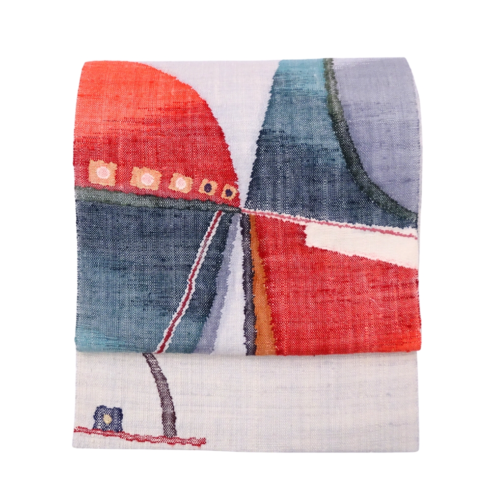 薄いグレー地の帯に、赤、青、緑、グレーなど、大胆な色使いで抽象的で現代的な柄が織り出されたすくい名古屋帯です。