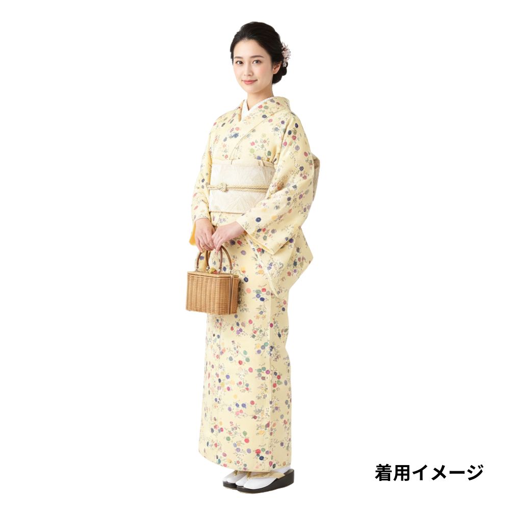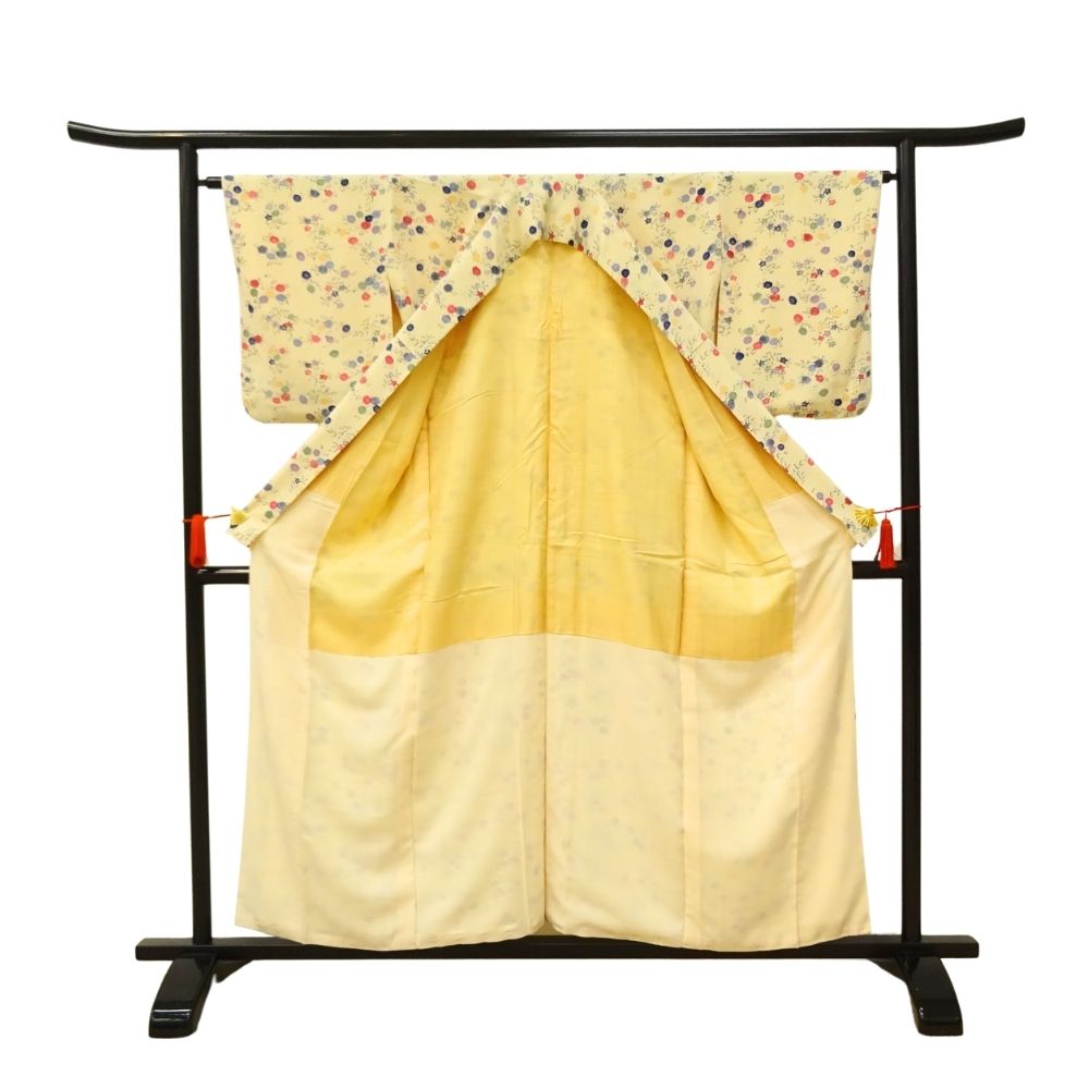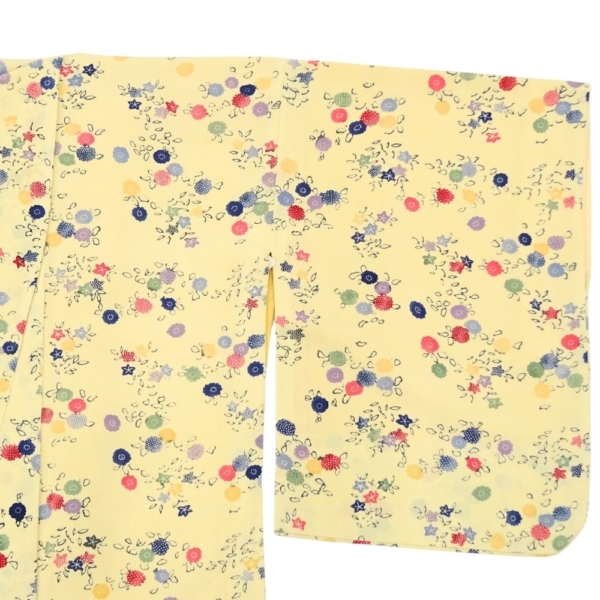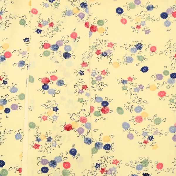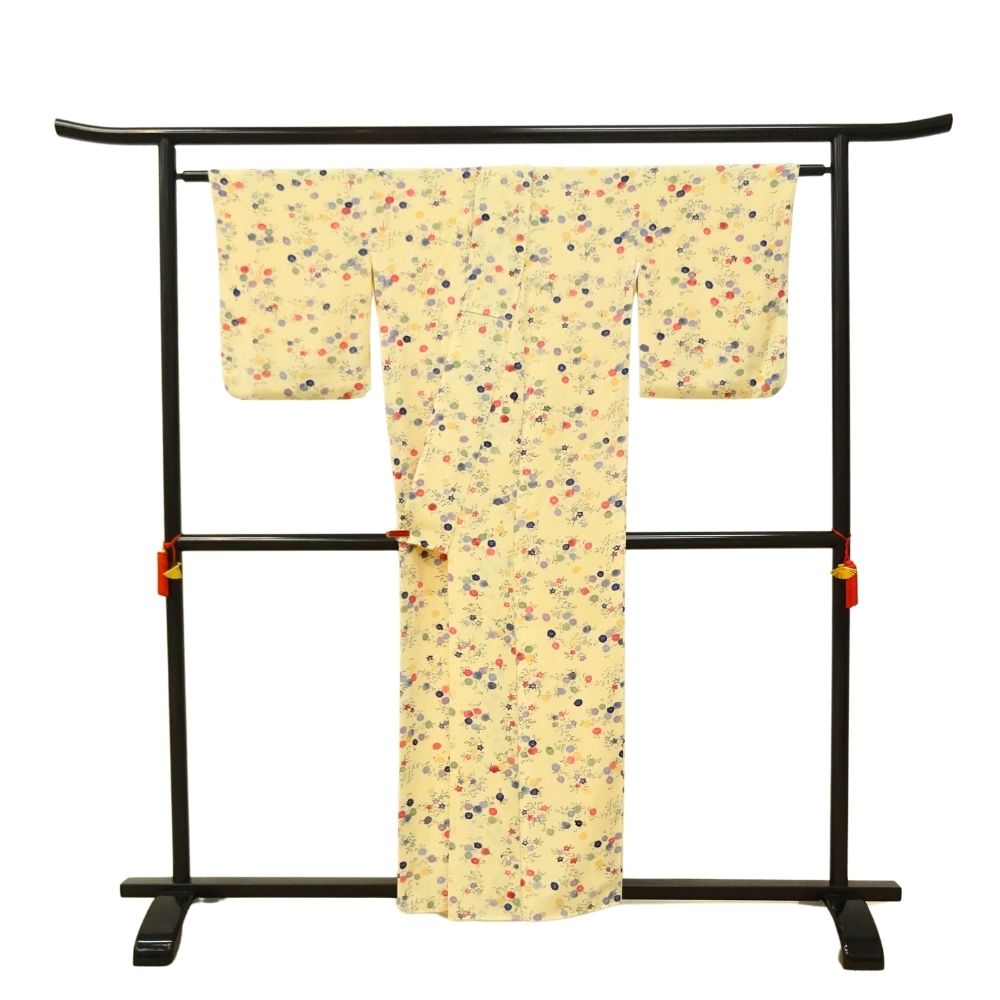 明るく優しいクリーム色の地色に、色とりどりの丸いお花が散りばめられた、大変可愛らしい小紋です。