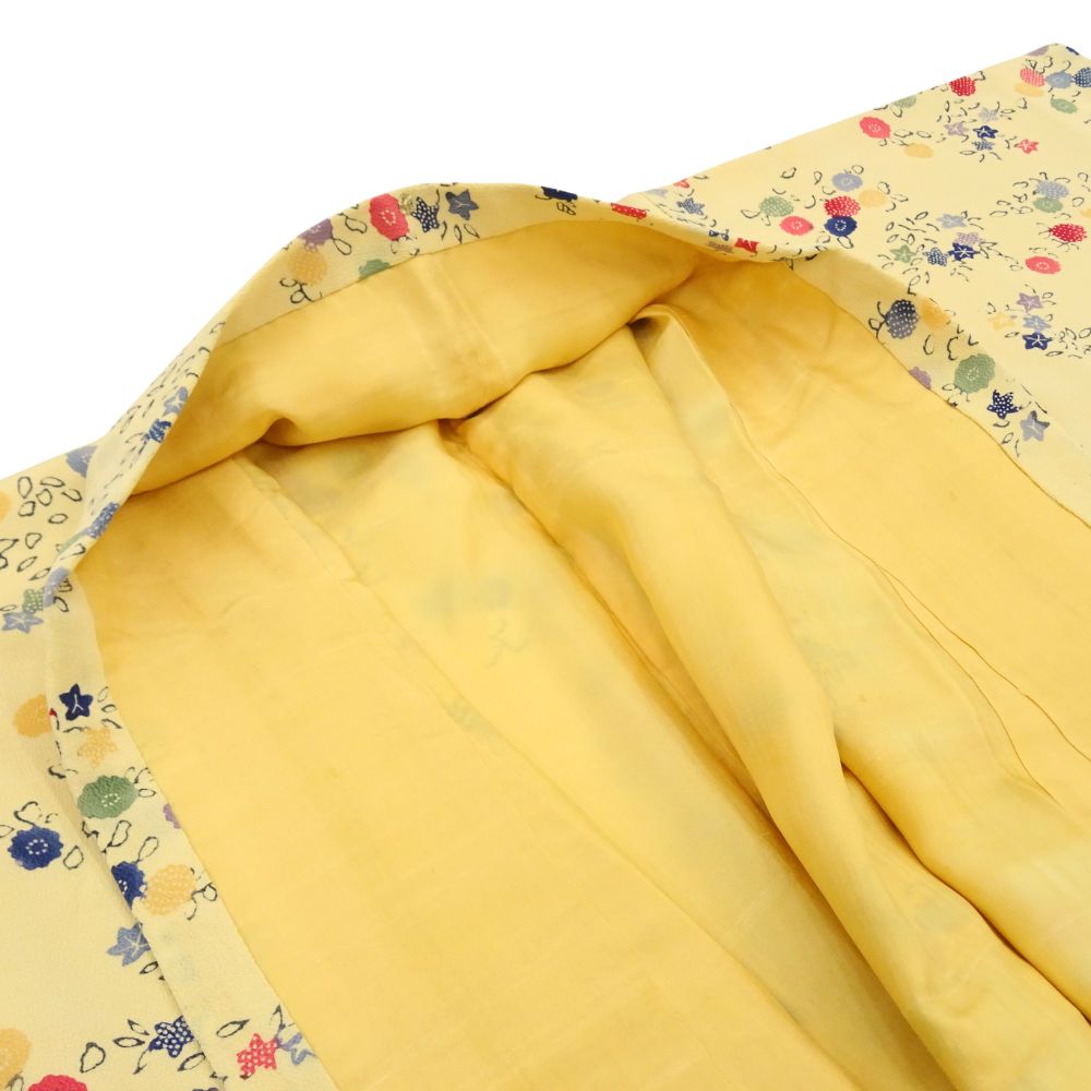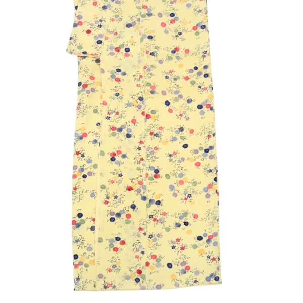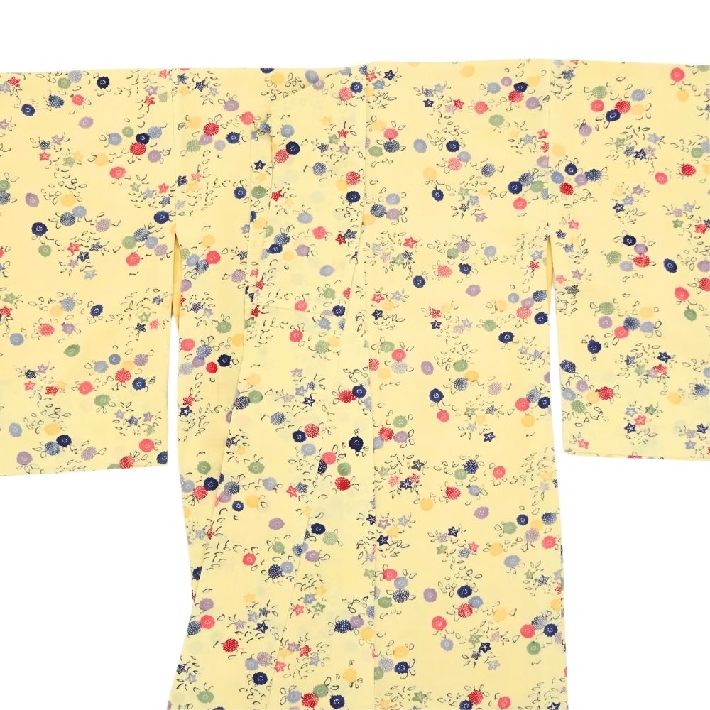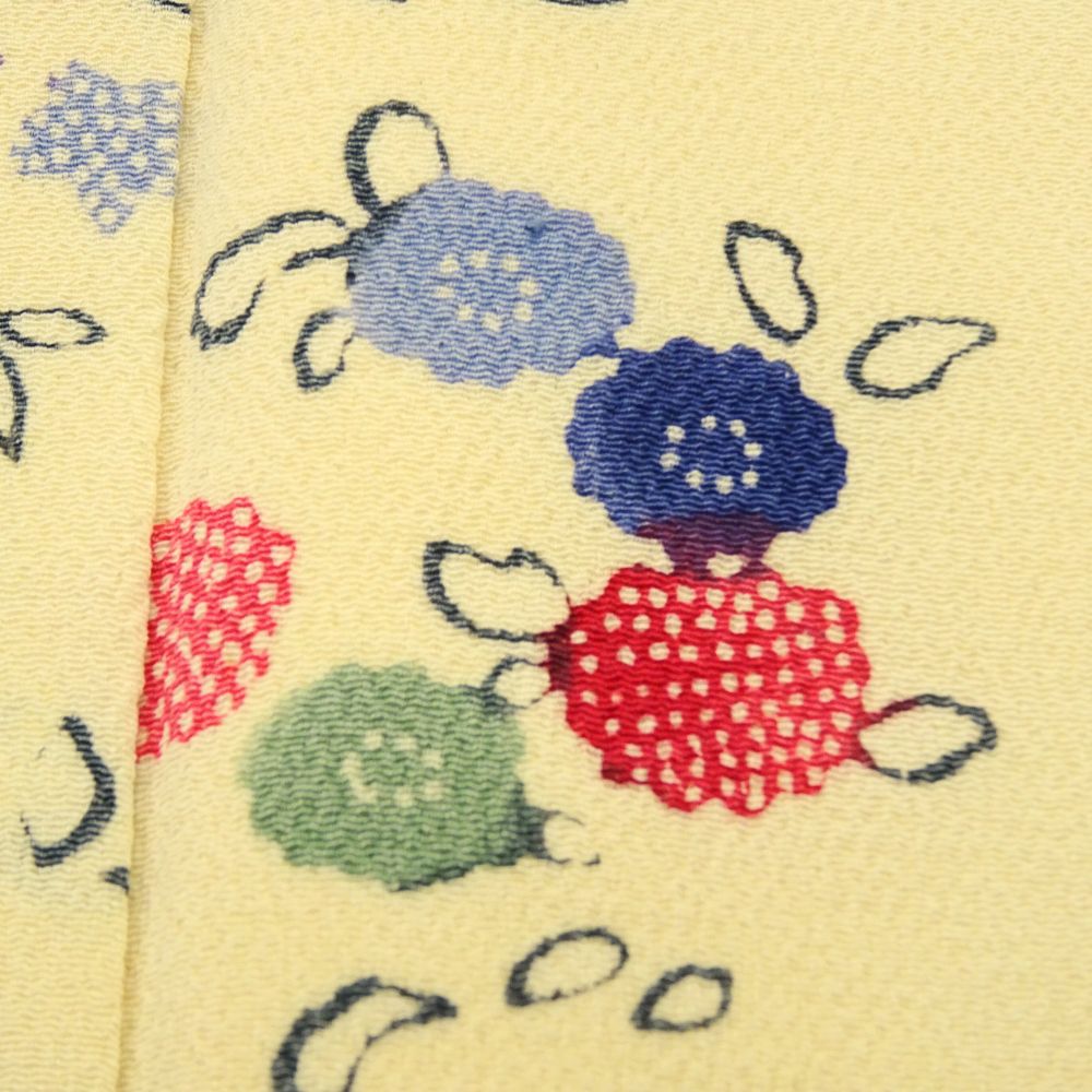 明るく優しいクリーム色の地色に、色とりどりの丸いお花が散りばめられた、大変可愛らしい小紋です。