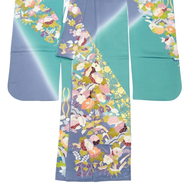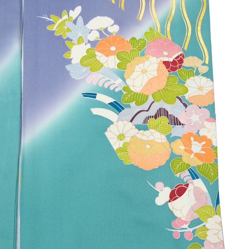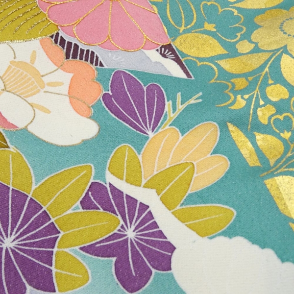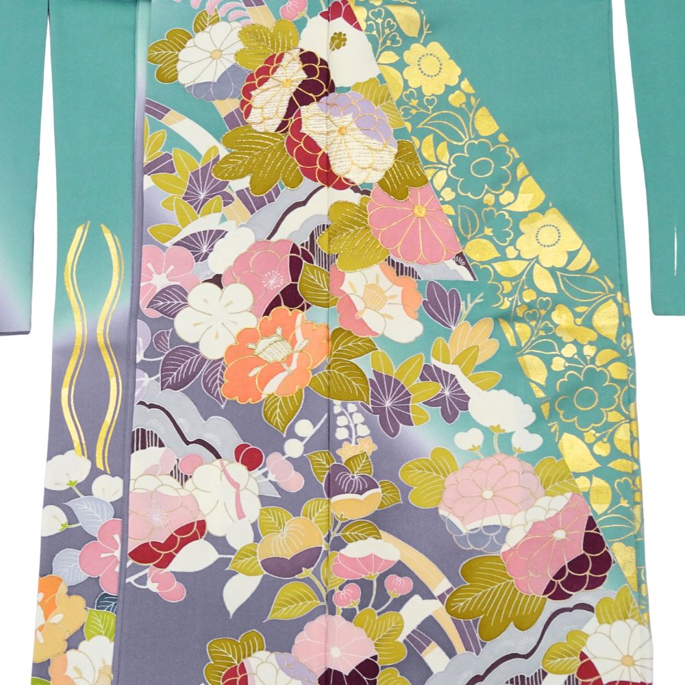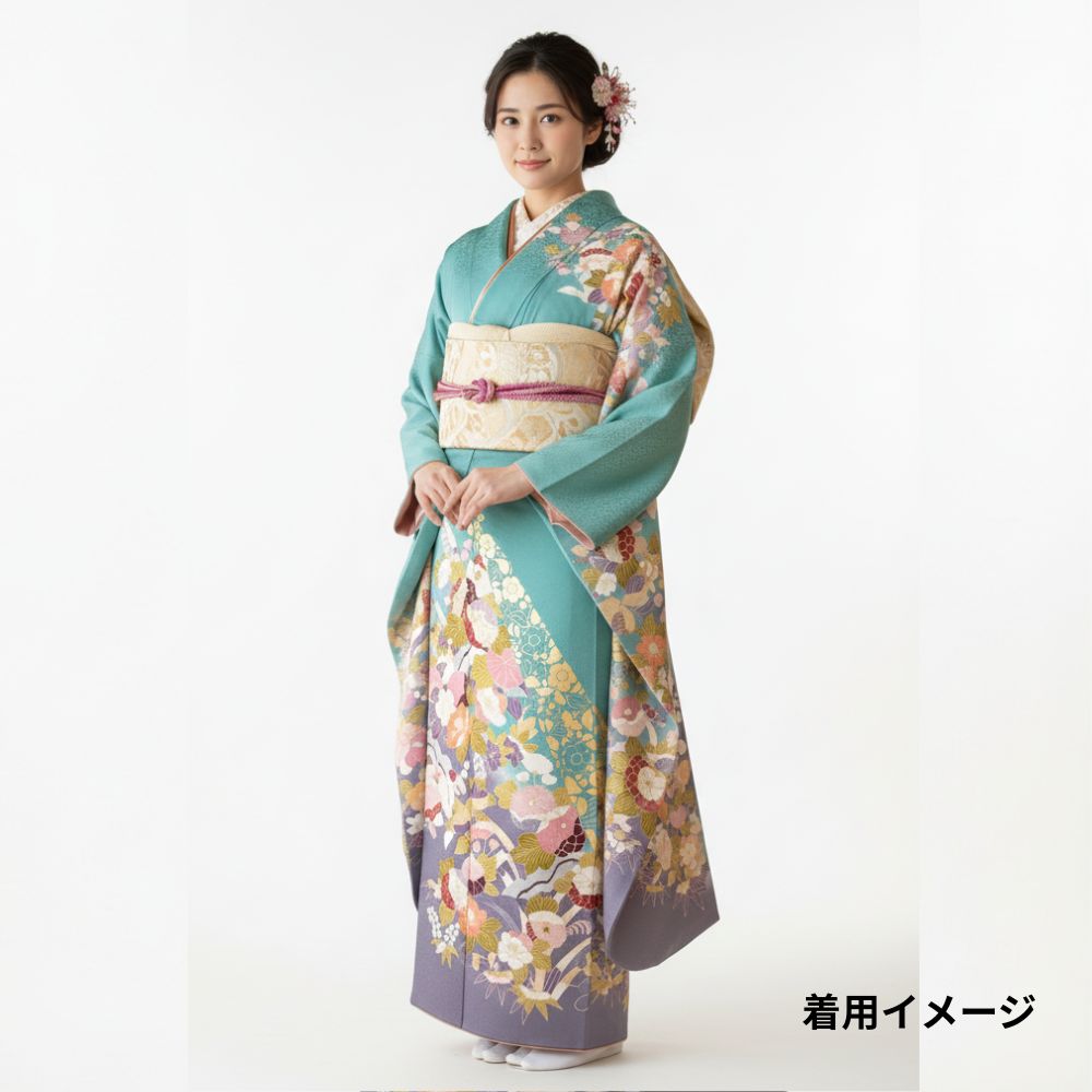 千總振袖 正絹 リユース 中古 吉祥花文 エメラルド×藤色 109-02-7 (8050-00502)