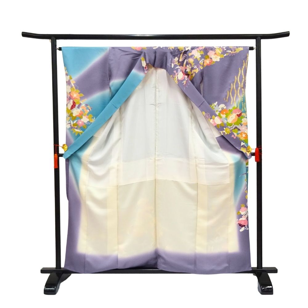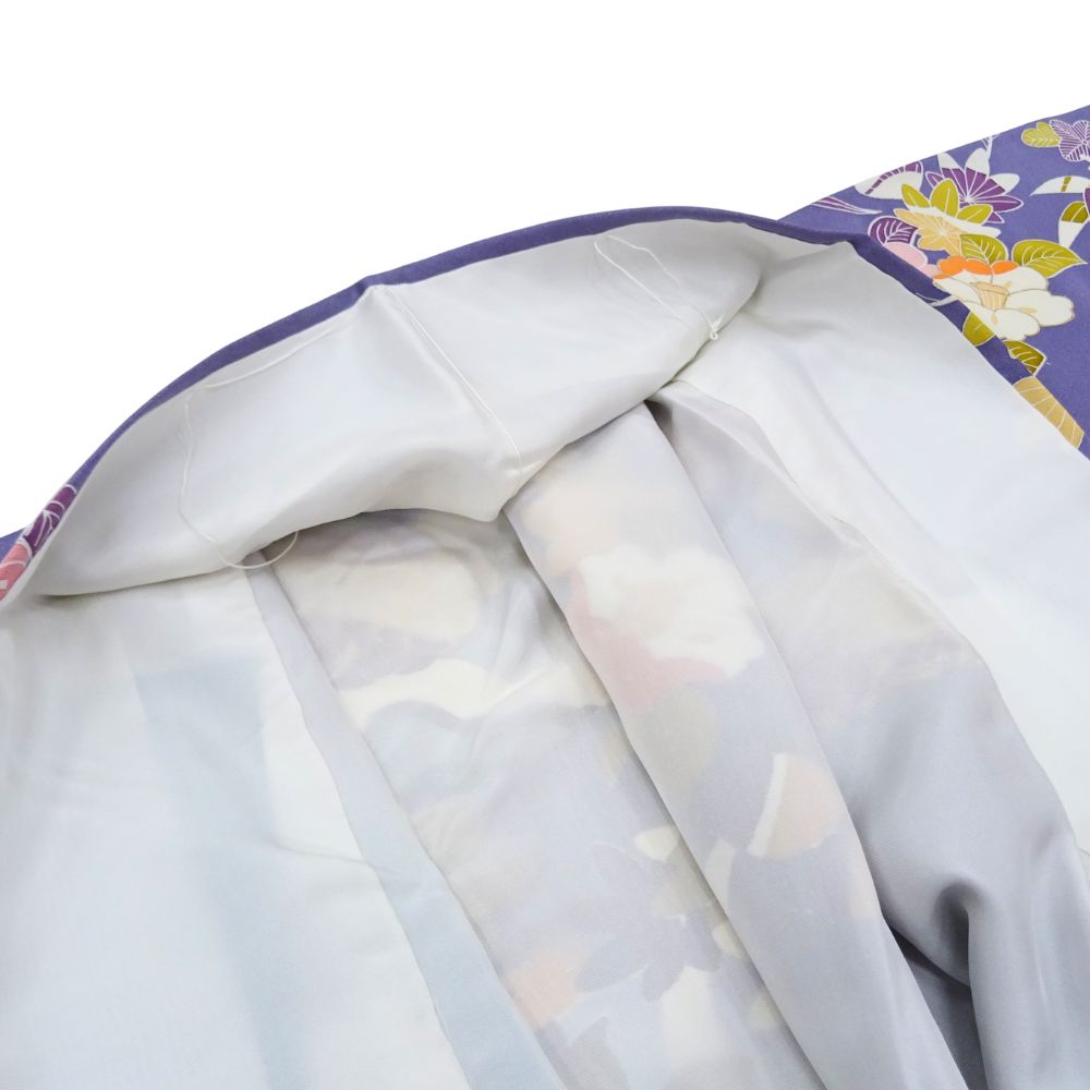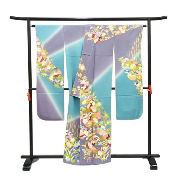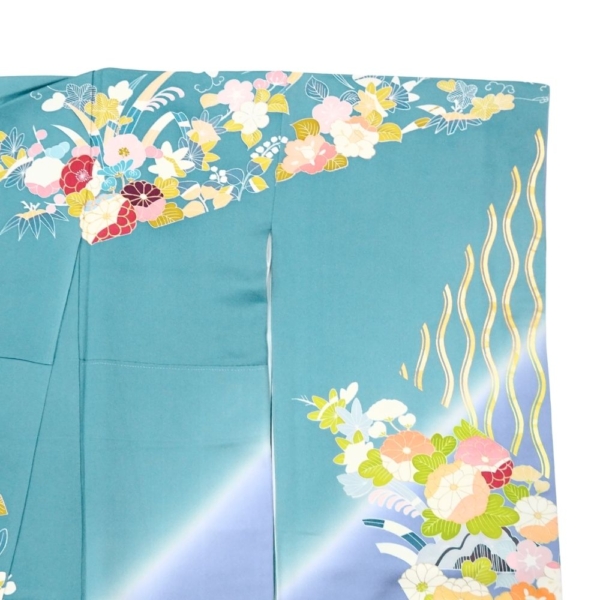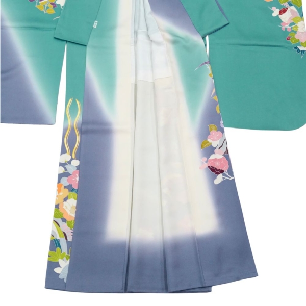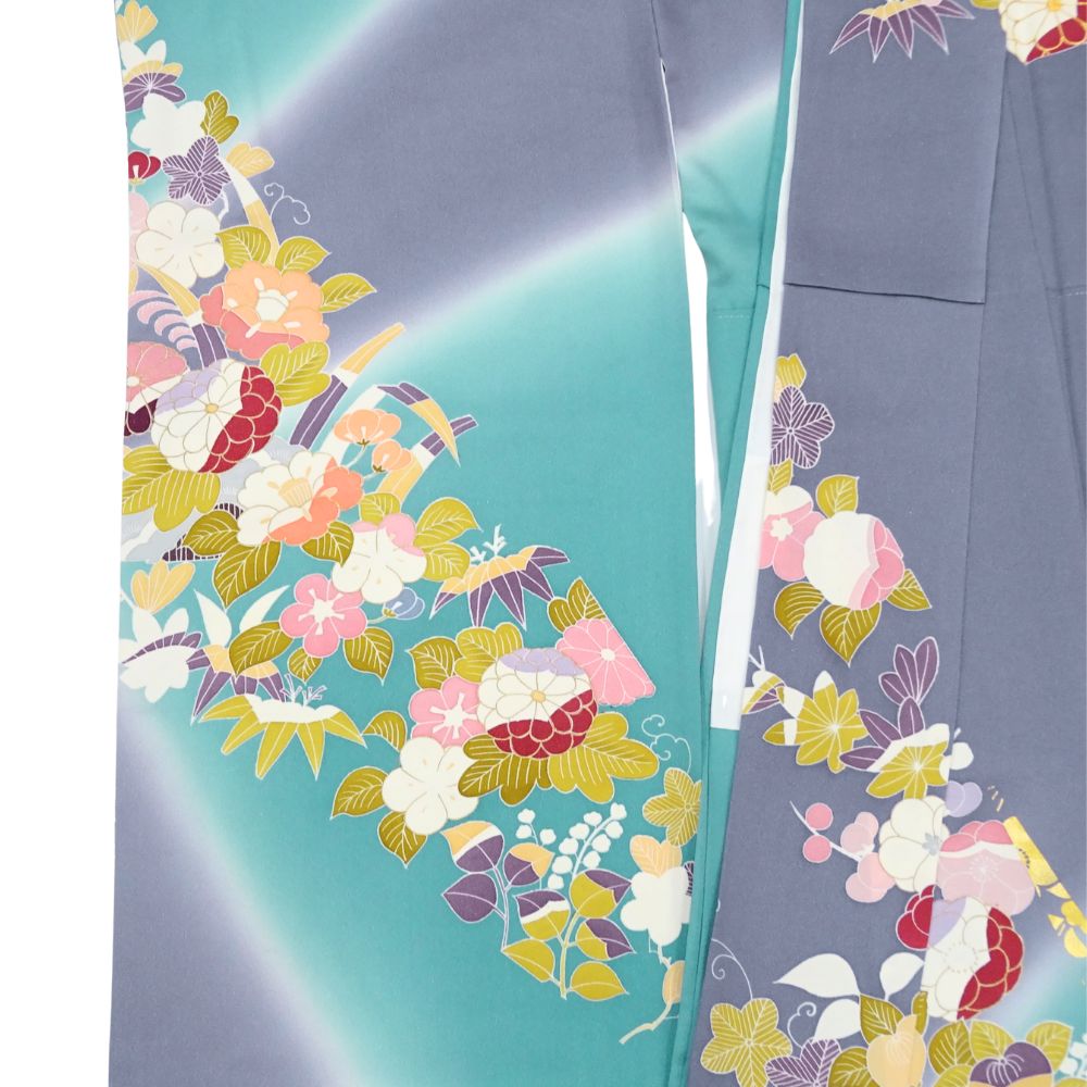 千總振袖 正絹 リユース 中古 吉祥花文 エメラルド×藤色 109-02-7 (8050-00502)
