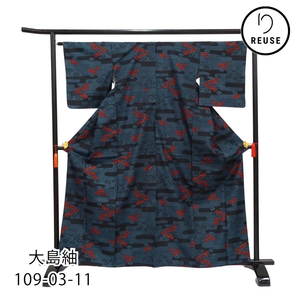 大島紬 袷 正絹 リユース 中古 エ霞文に赤い花 109-03-11 (8050-00521)