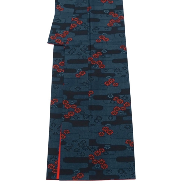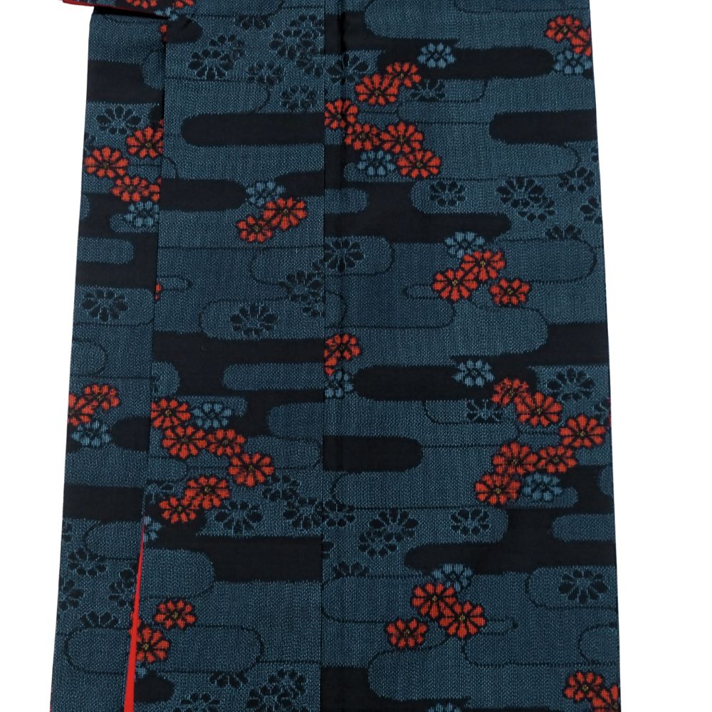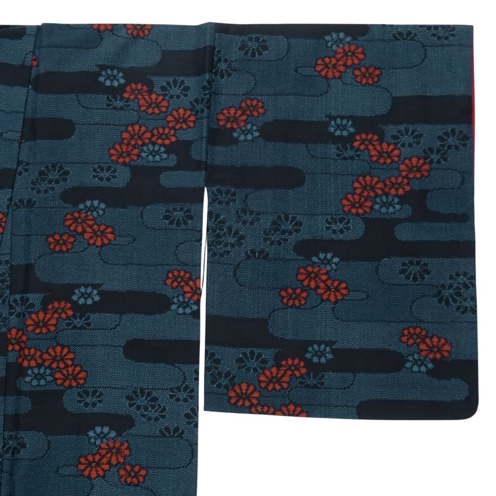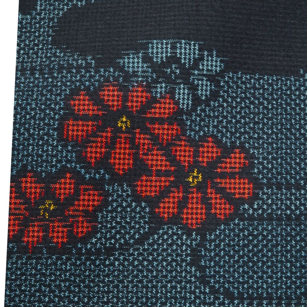 深みのある青緑にも見える濃紺の地に、エ霞文様がリズム感を生み出し、鮮やかな赤や渋い紺の小花柄が散りばめられています。