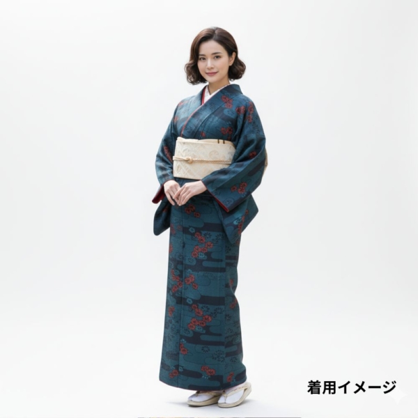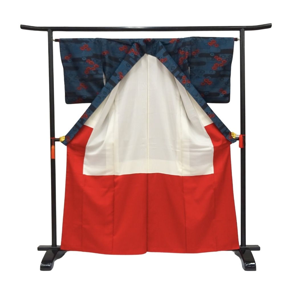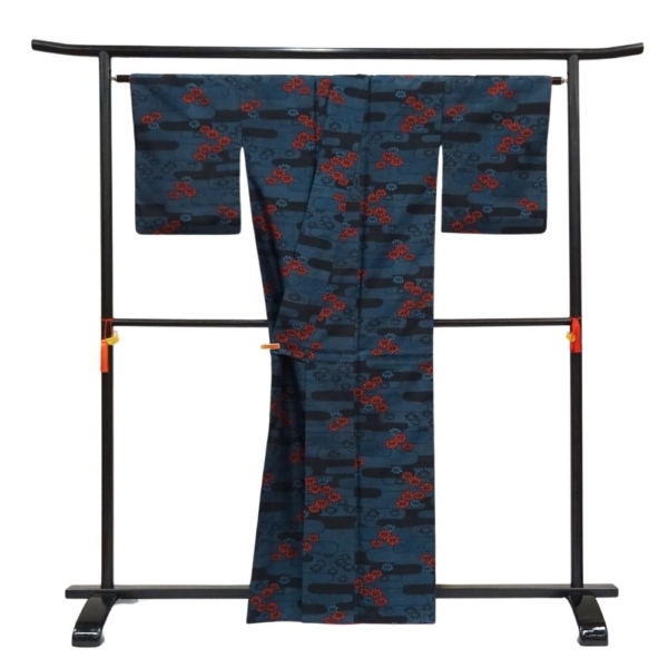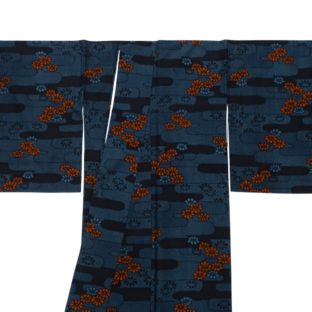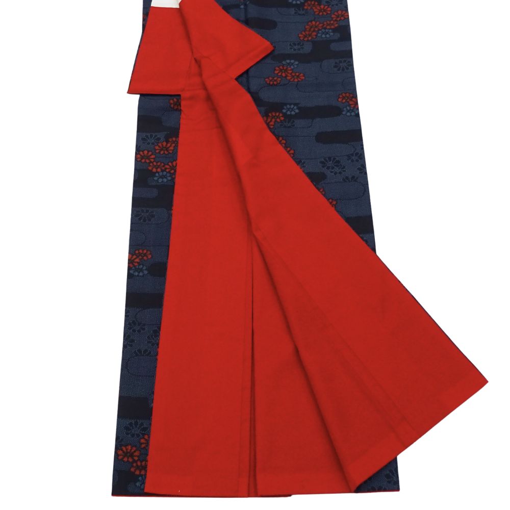 深みのある青緑にも見える濃紺の地に、エ霞文様がリズム感を生み出し、鮮やかな赤や渋い紺の小花柄が散りばめられています。