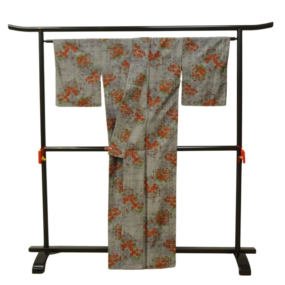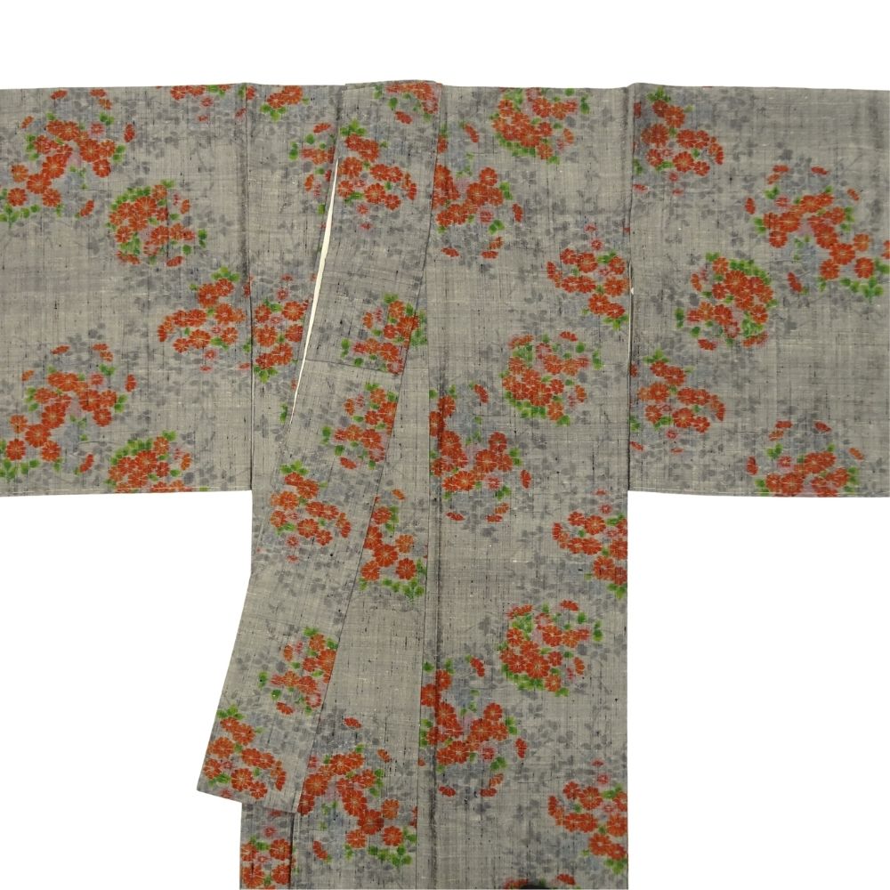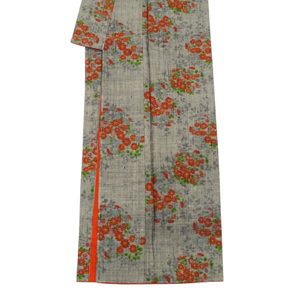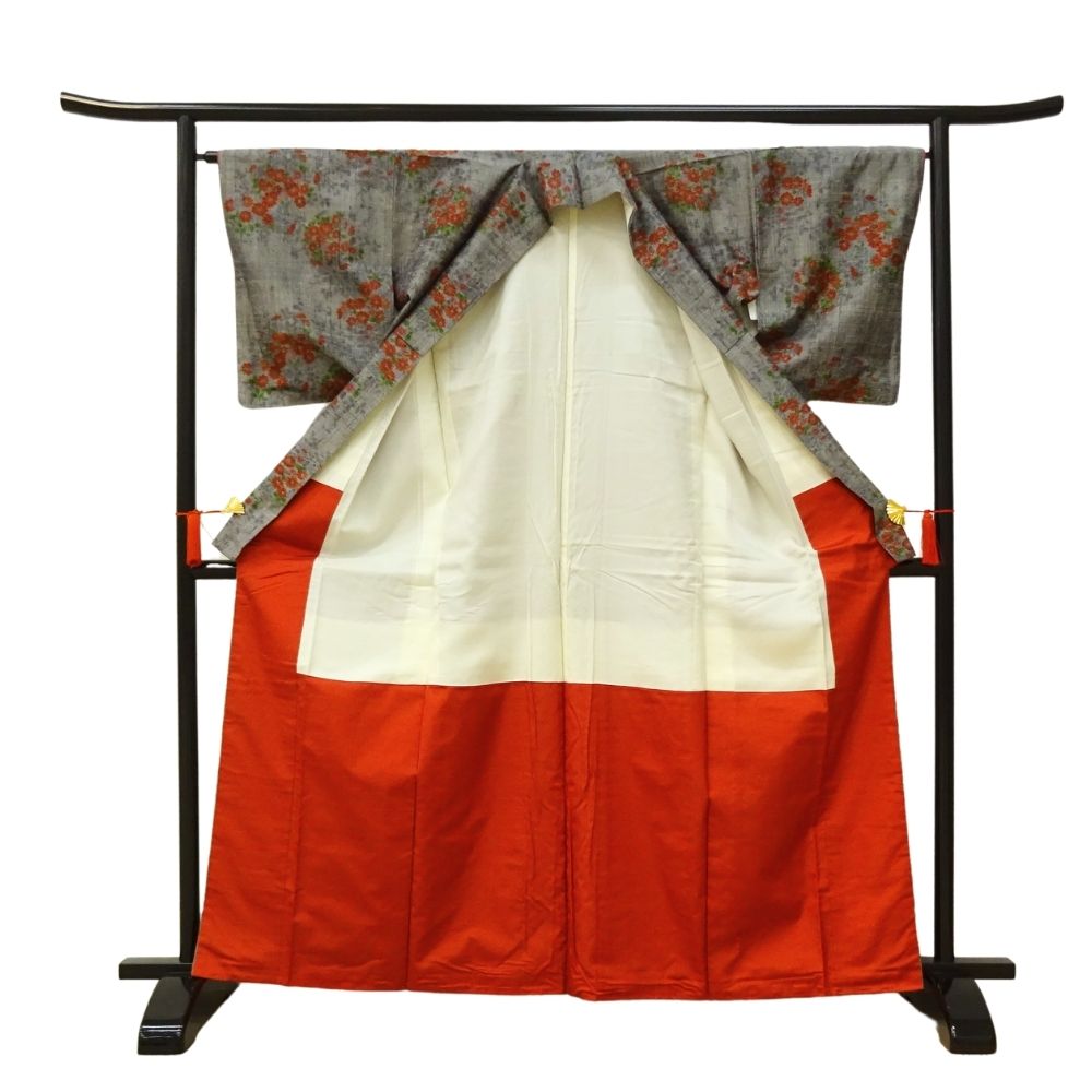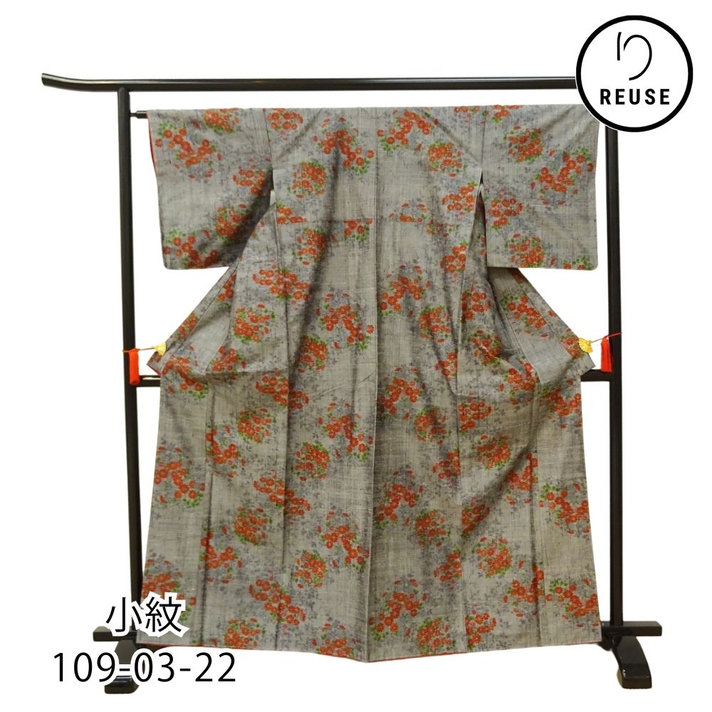 小紋 正絹 リユース 中古 グレー 紬調 赤い花柄109-03-22 (8050-00532)
