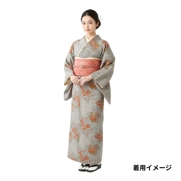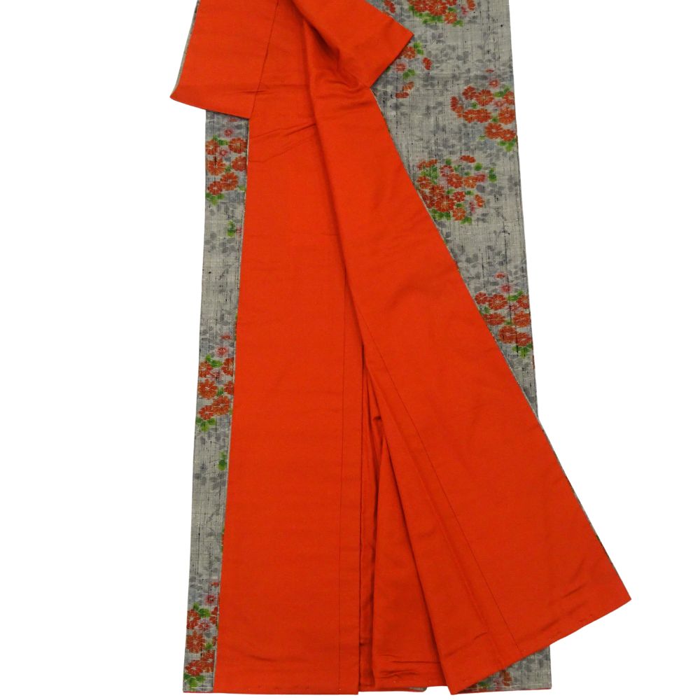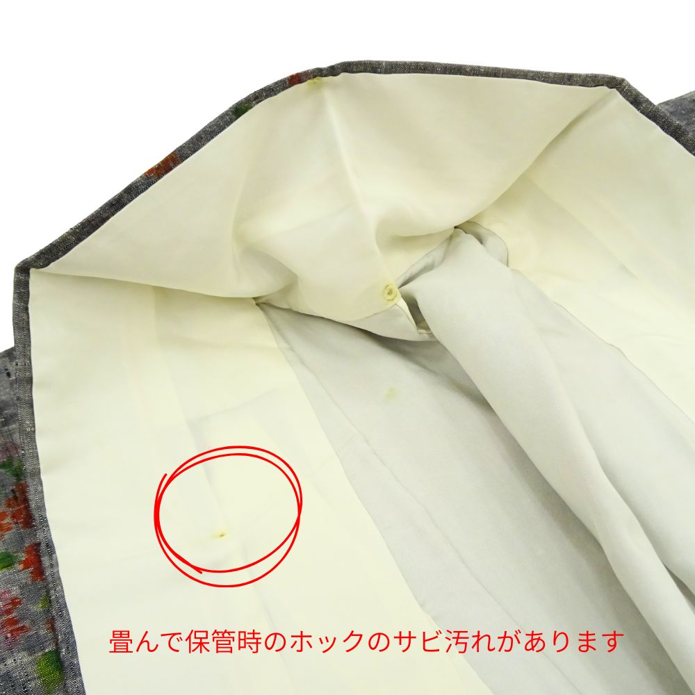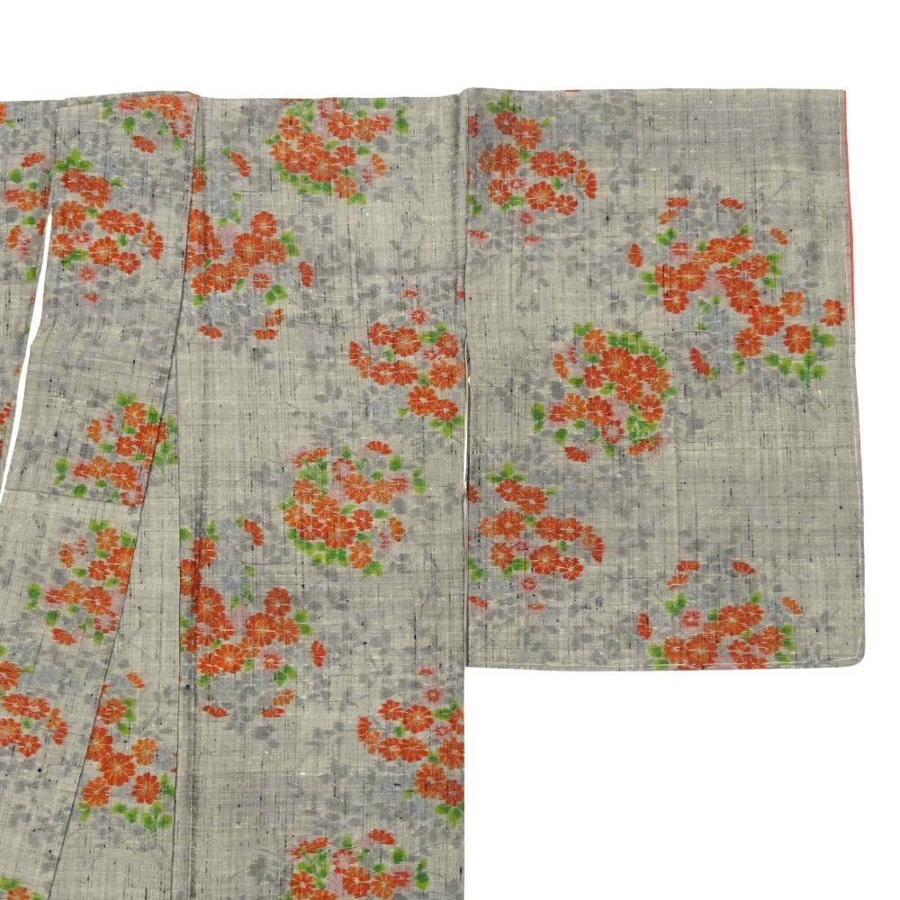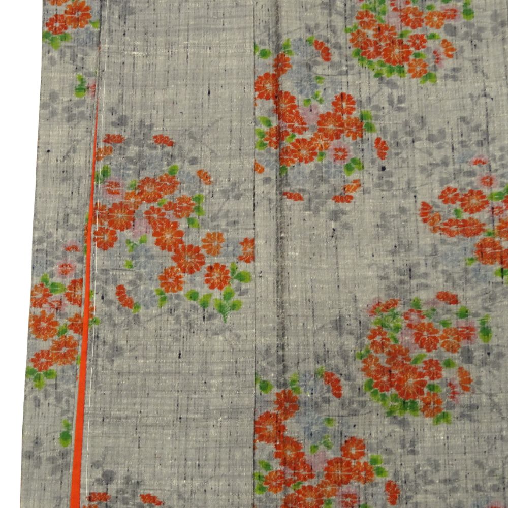 小紋 正絹 リユース 中古 グレー 紬調 赤い花柄109-03-22 (8050-00532)
