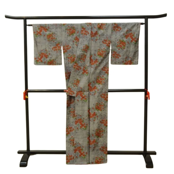 グレーの落ち着いた地色に、パッと目を引く朱赤の花々が咲き誇る、非常にデザイン性の高い小紋です。