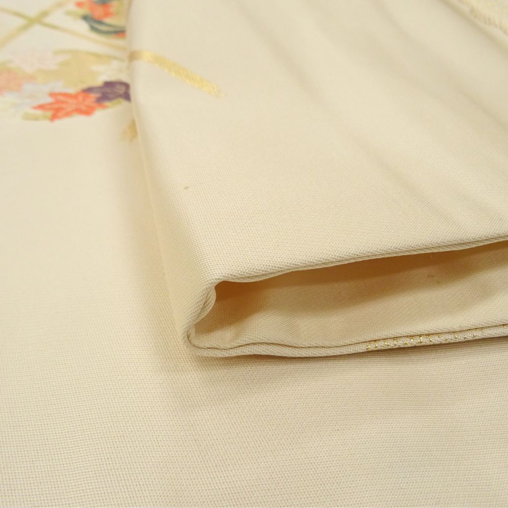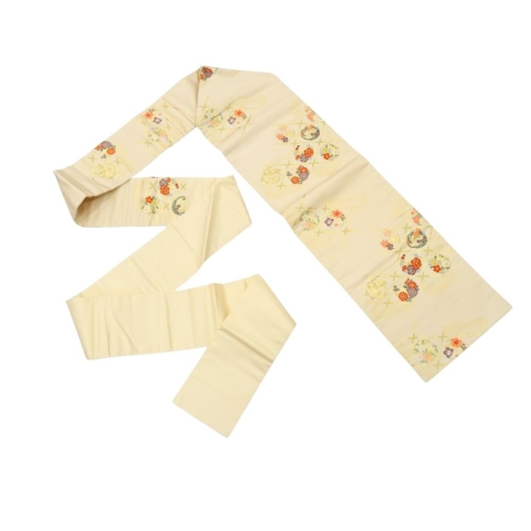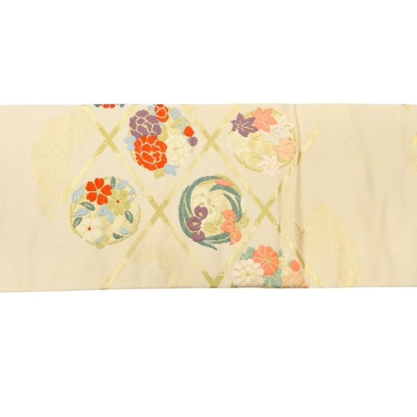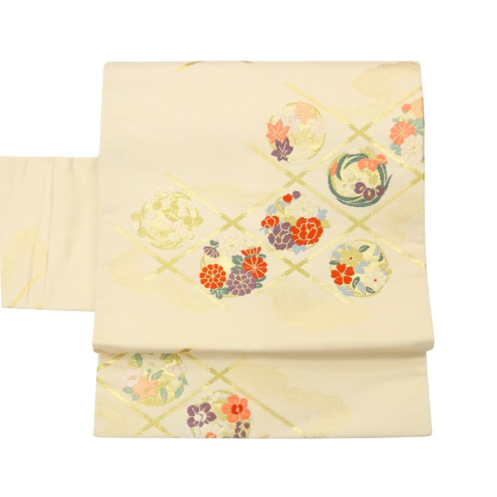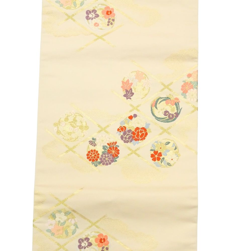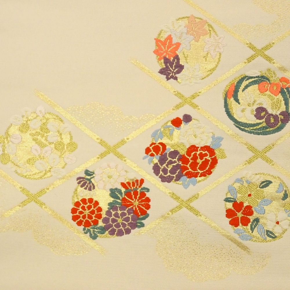 名古屋帯 リユース 中古 正絹 オフホワイト 丸紋 立涌 四季の花 109-03-4(8050-00514)
