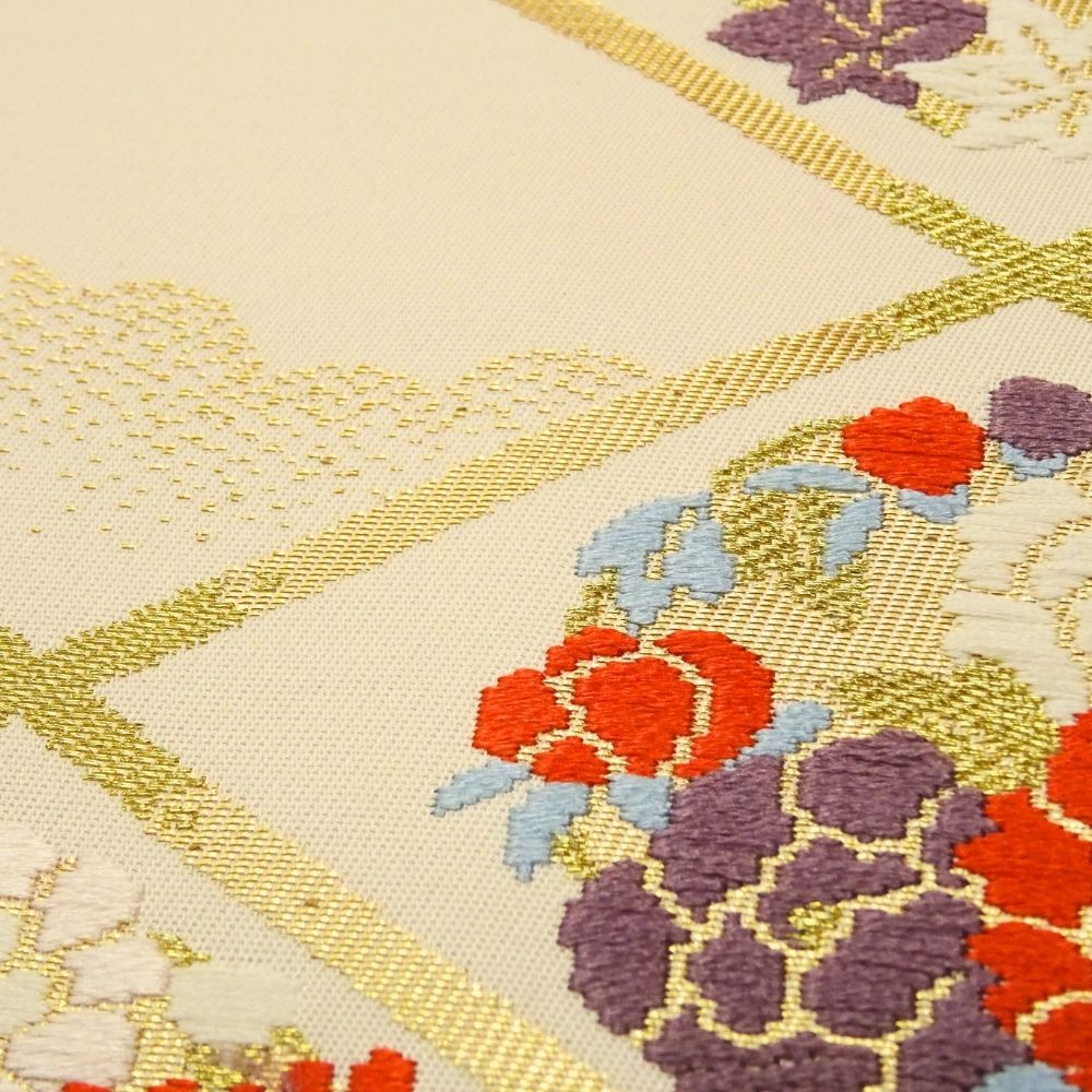 清潔感のあるオフホワイトの地に、菊や松、楓といった四季折々の花々が立体的かつ鮮やかに織り出されています。