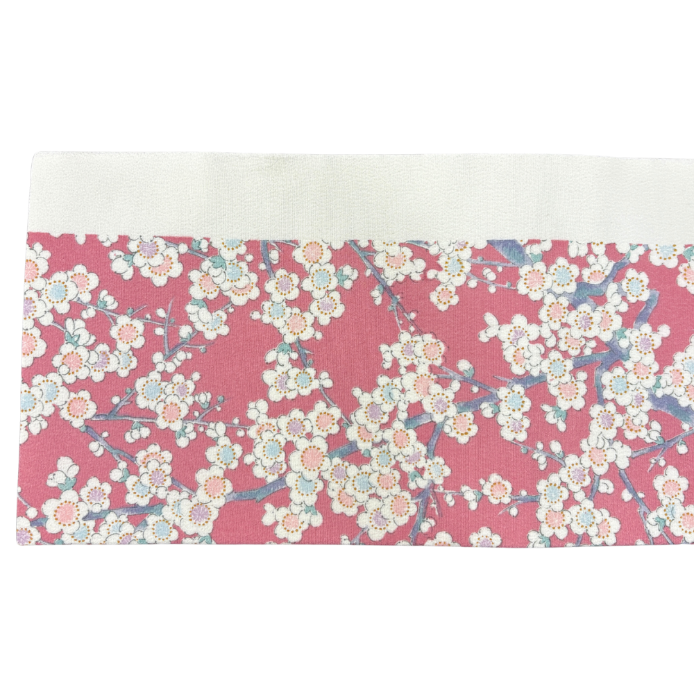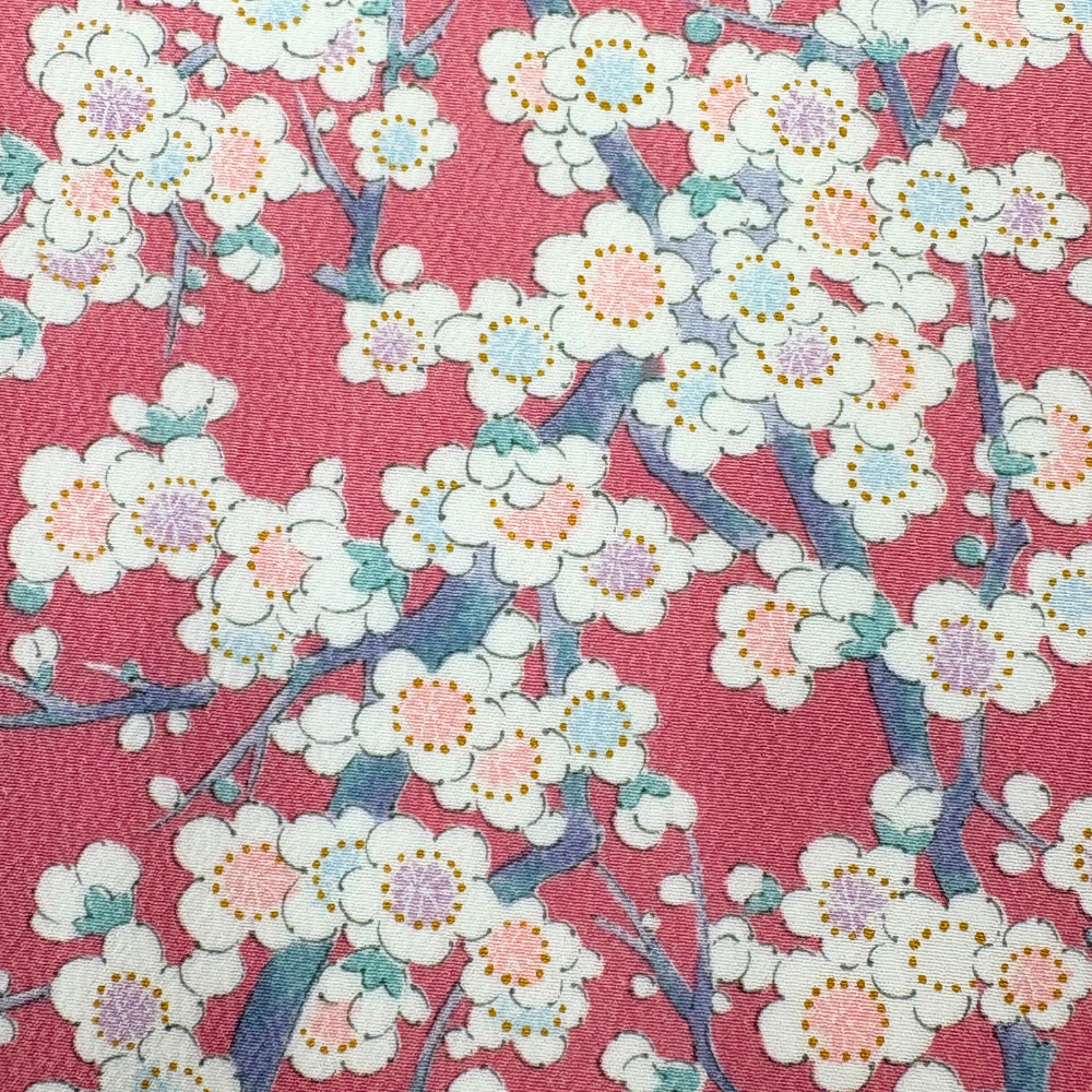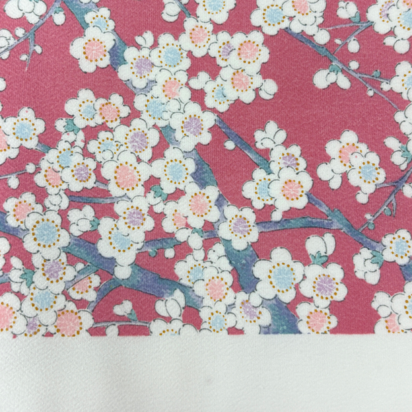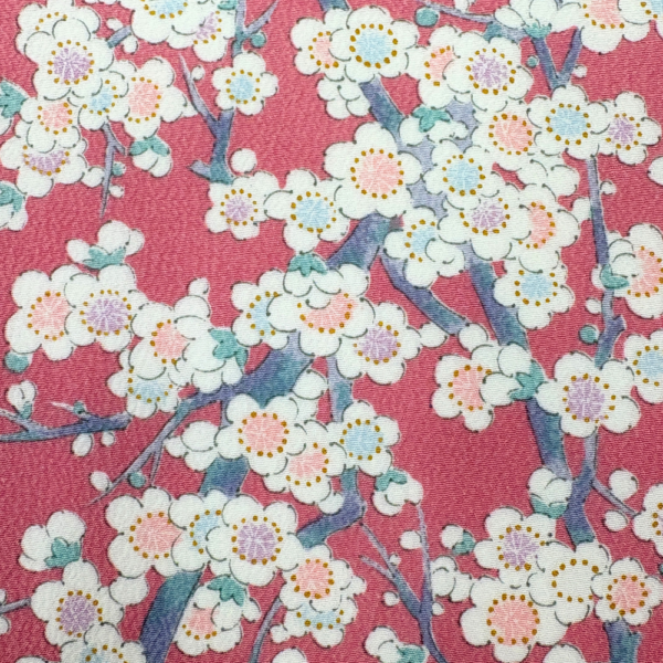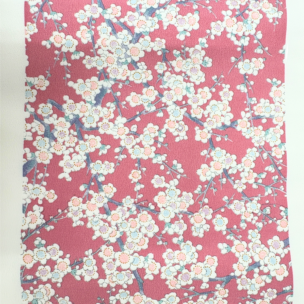 落ち着いたピンク地に、梅の花が咲き誇る、クラシックながらも華やかなデザインです。