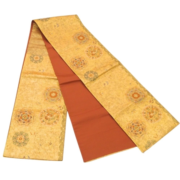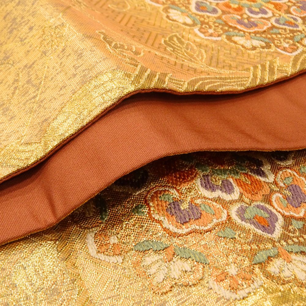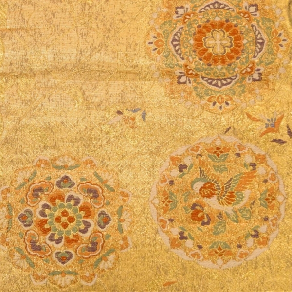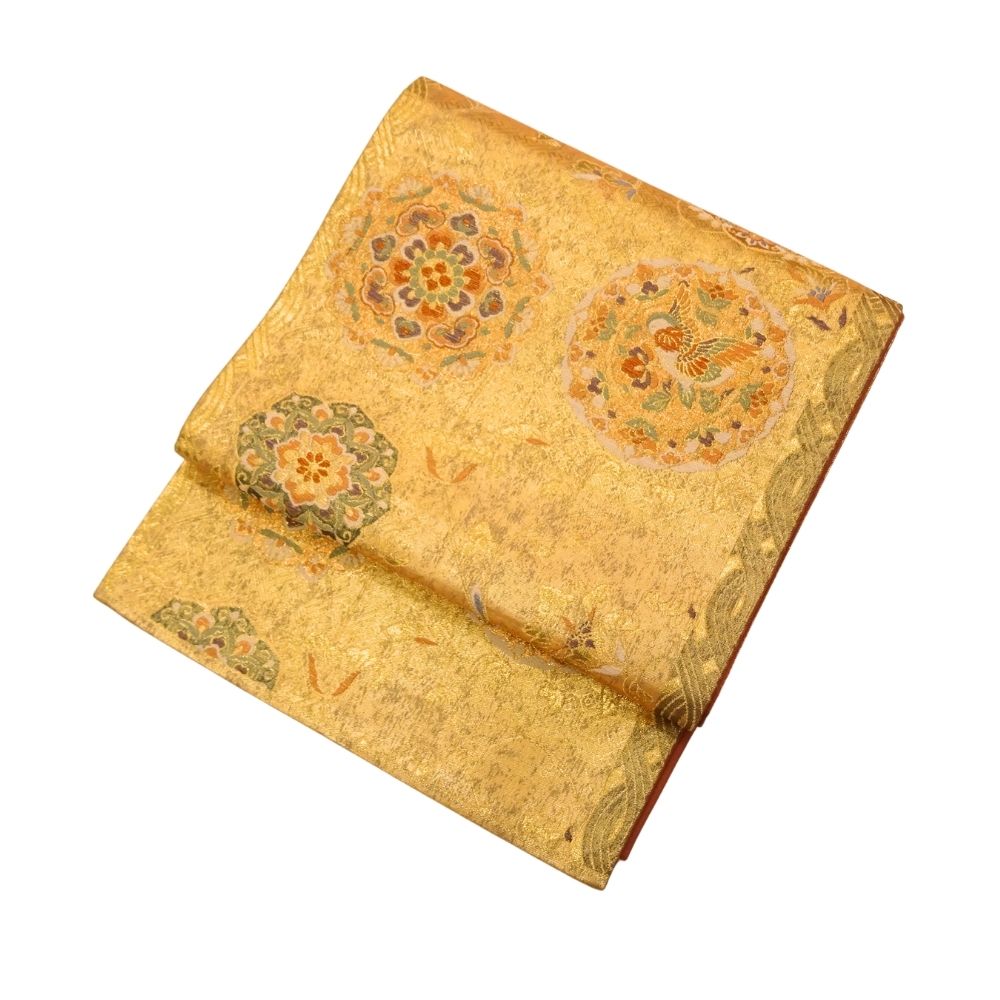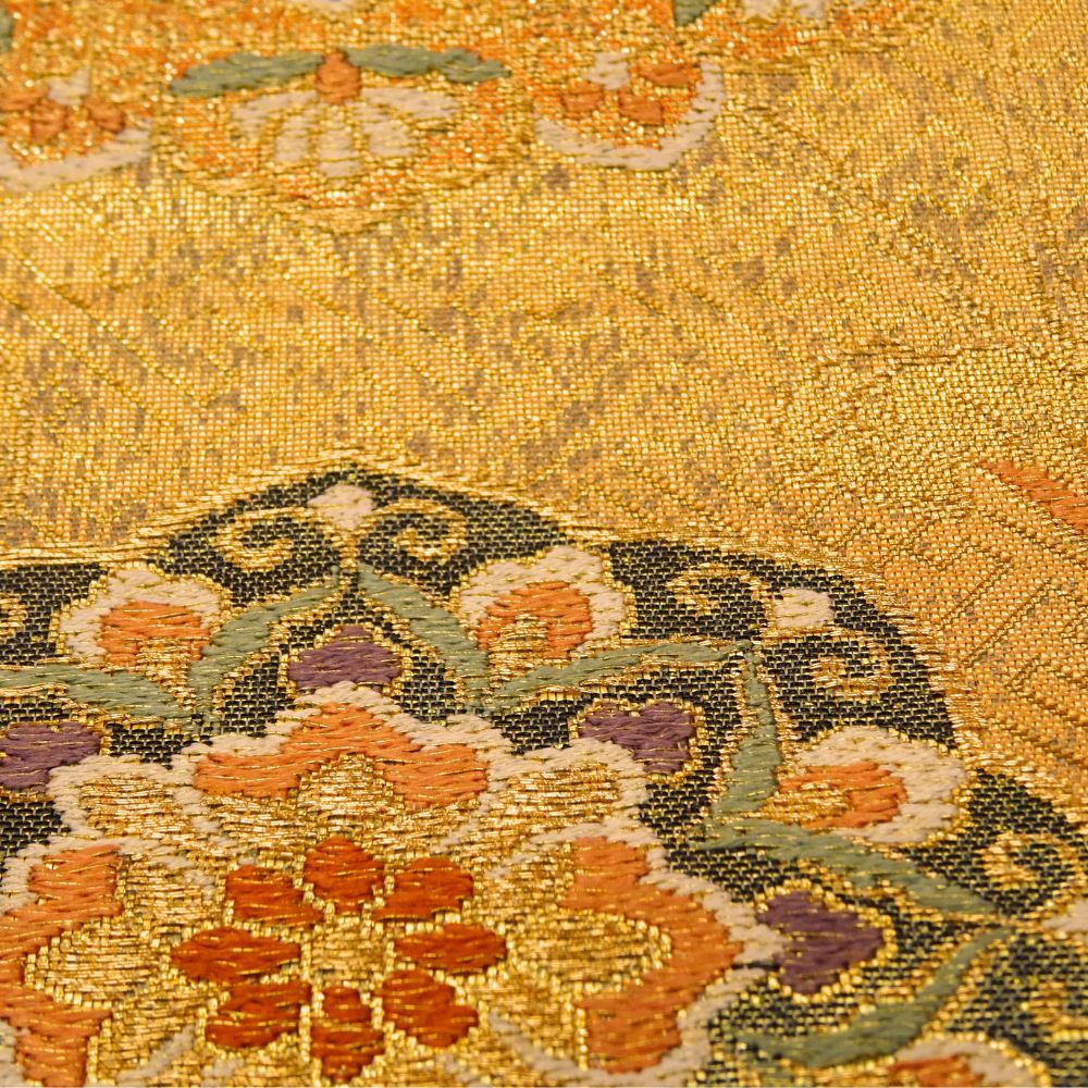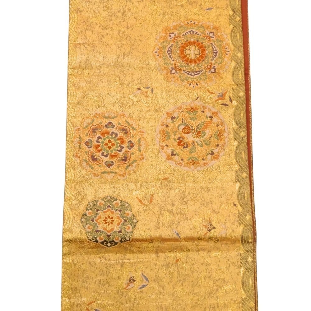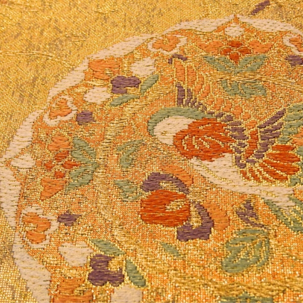 まばゆいばかりの金地に、吉祥文様の代表格である「鳳凰」と「華文」が贅沢に織り出された袋帯です。