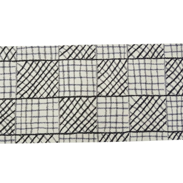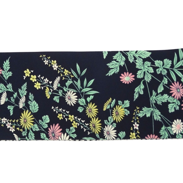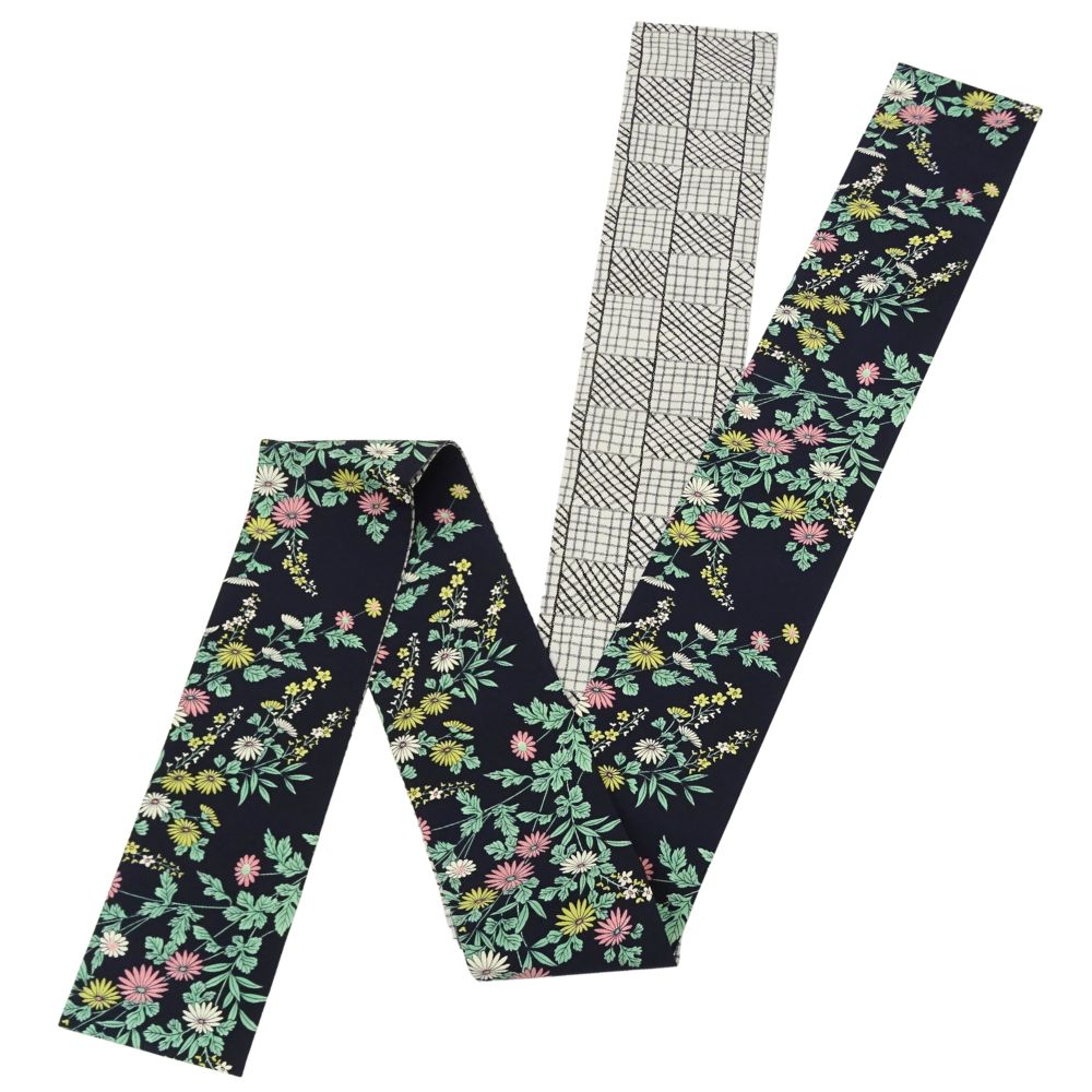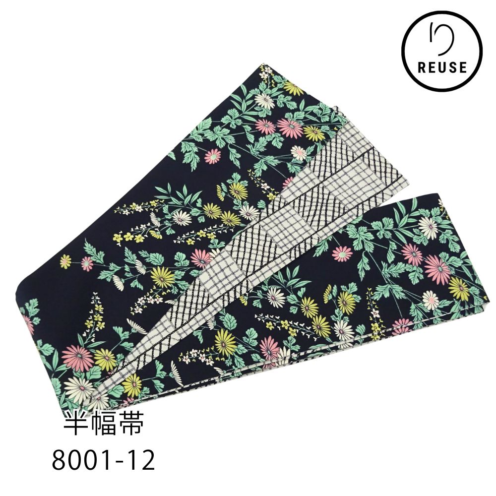 半幅帯 正絹 リユース 未使用品 濃紺地 菊・草花 × 白地 市松格子 8001-12(8050-00995) モダン 浴衣 小紋 カジュアル