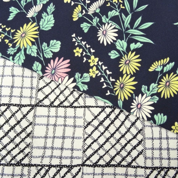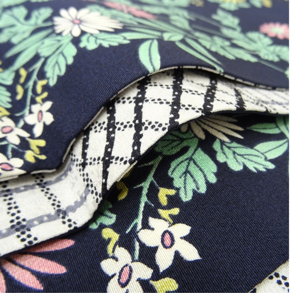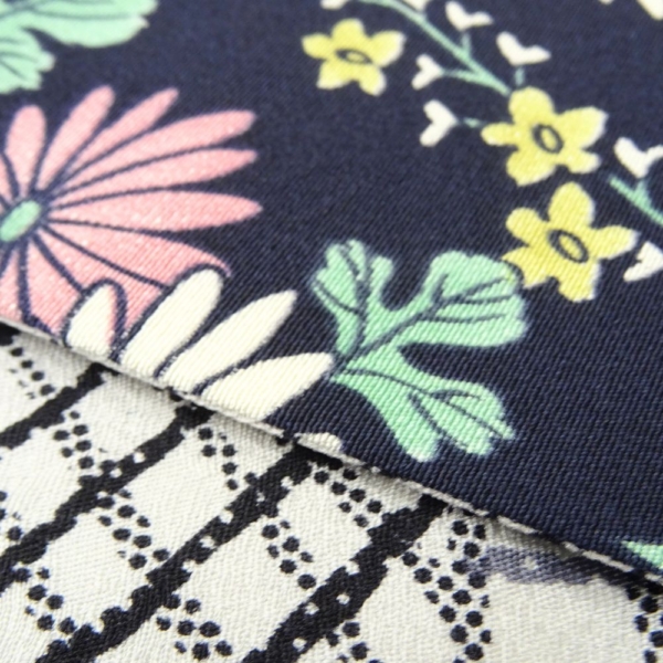 落ち着いたネイビーに彩り豊かな草花が映える面と、モノトーンで都会的な格子柄の面。