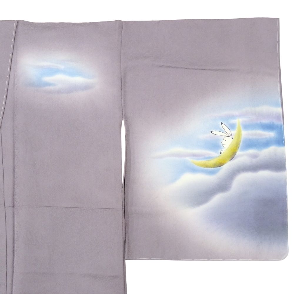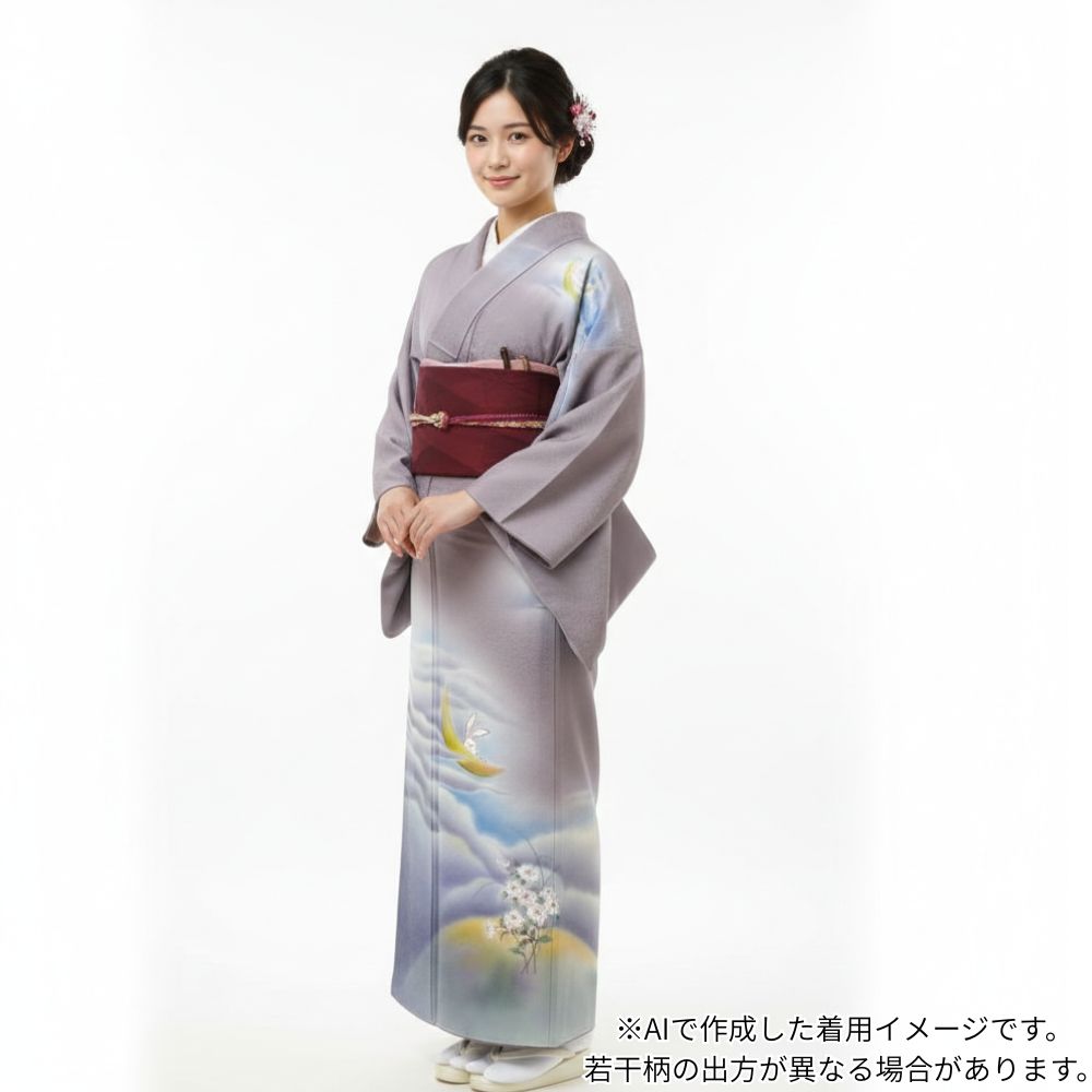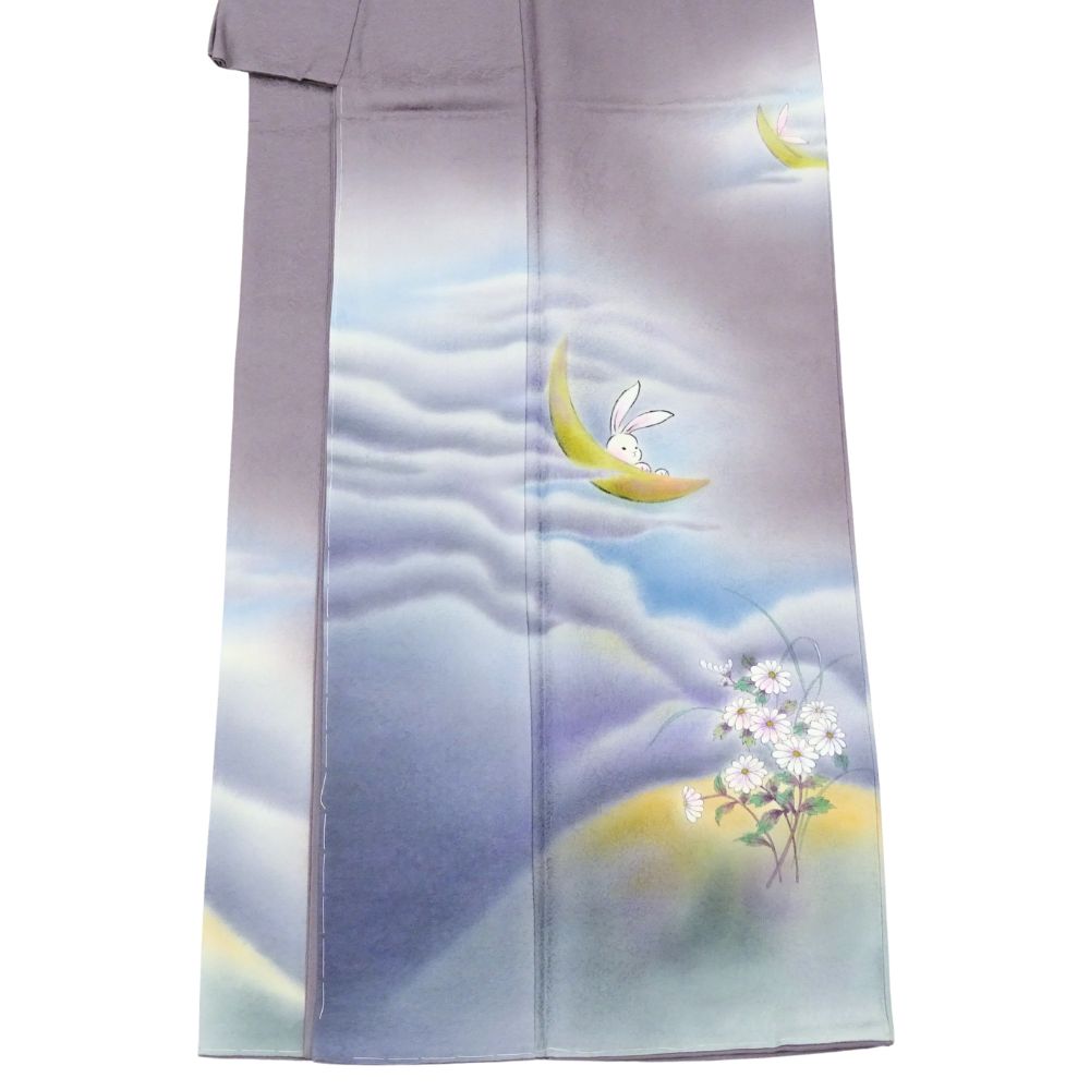 落ち着きのある上品なグレーの地に、夜空に浮かぶ三日月と、その光に照らされたかのような愛らしい兎、そして優美な草花が描かれた正絹の訪問着です。