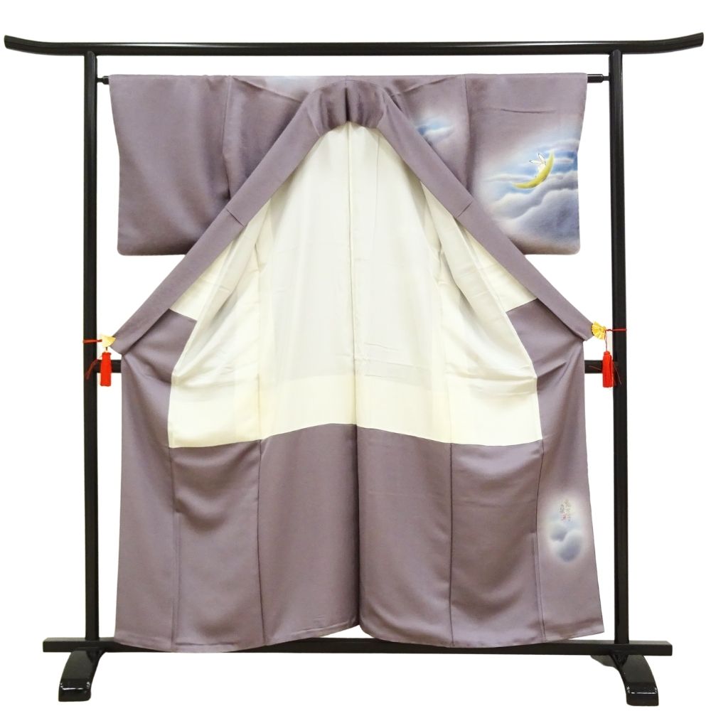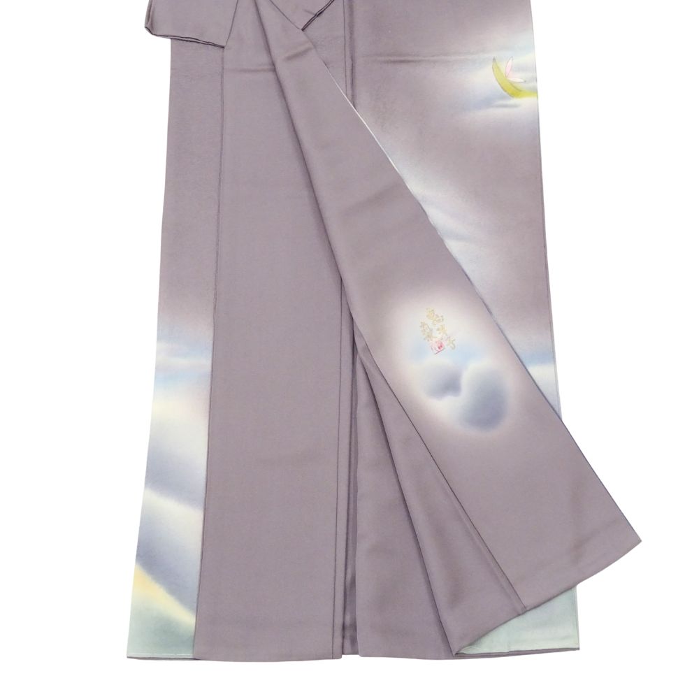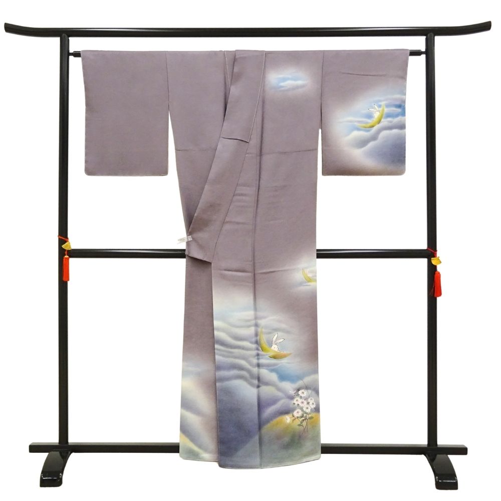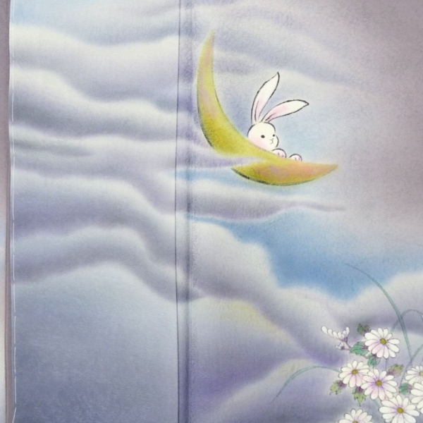 落ち着きのある上品なグレーの地に、夜空に浮かぶ三日月と、その光に照らされたかのような愛らしい兎、そして優美な草花が描かれた正絹の訪問着です。