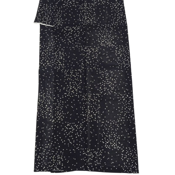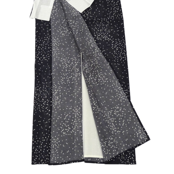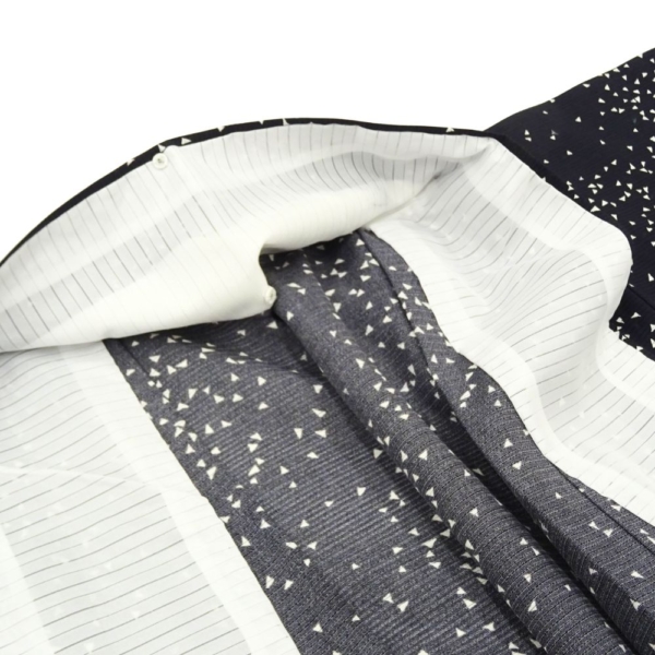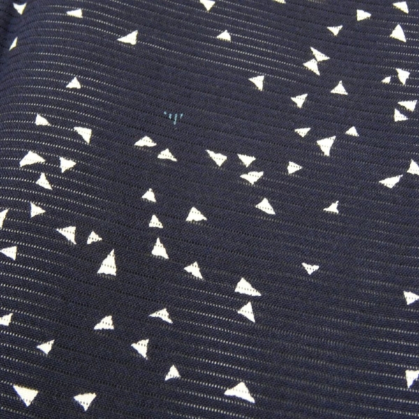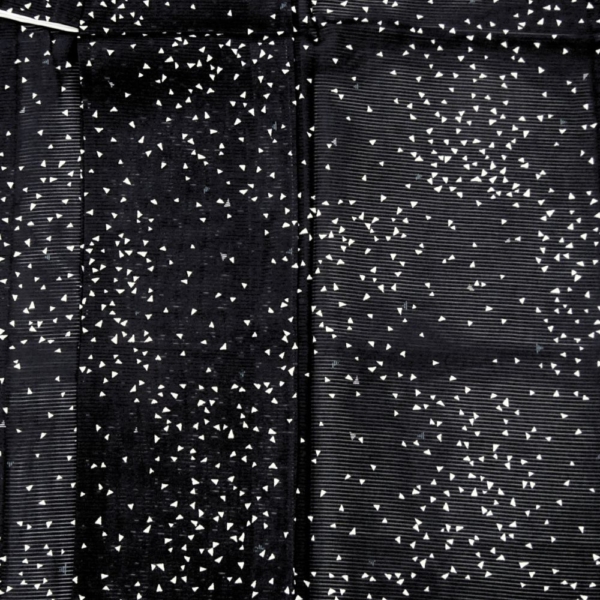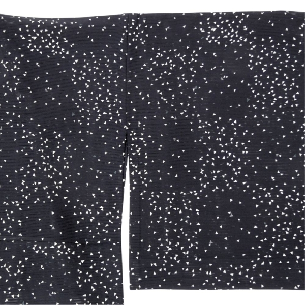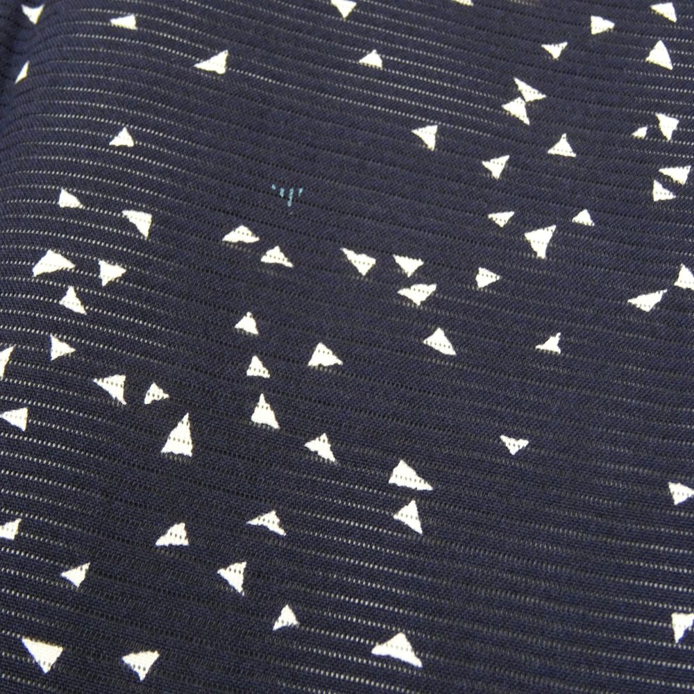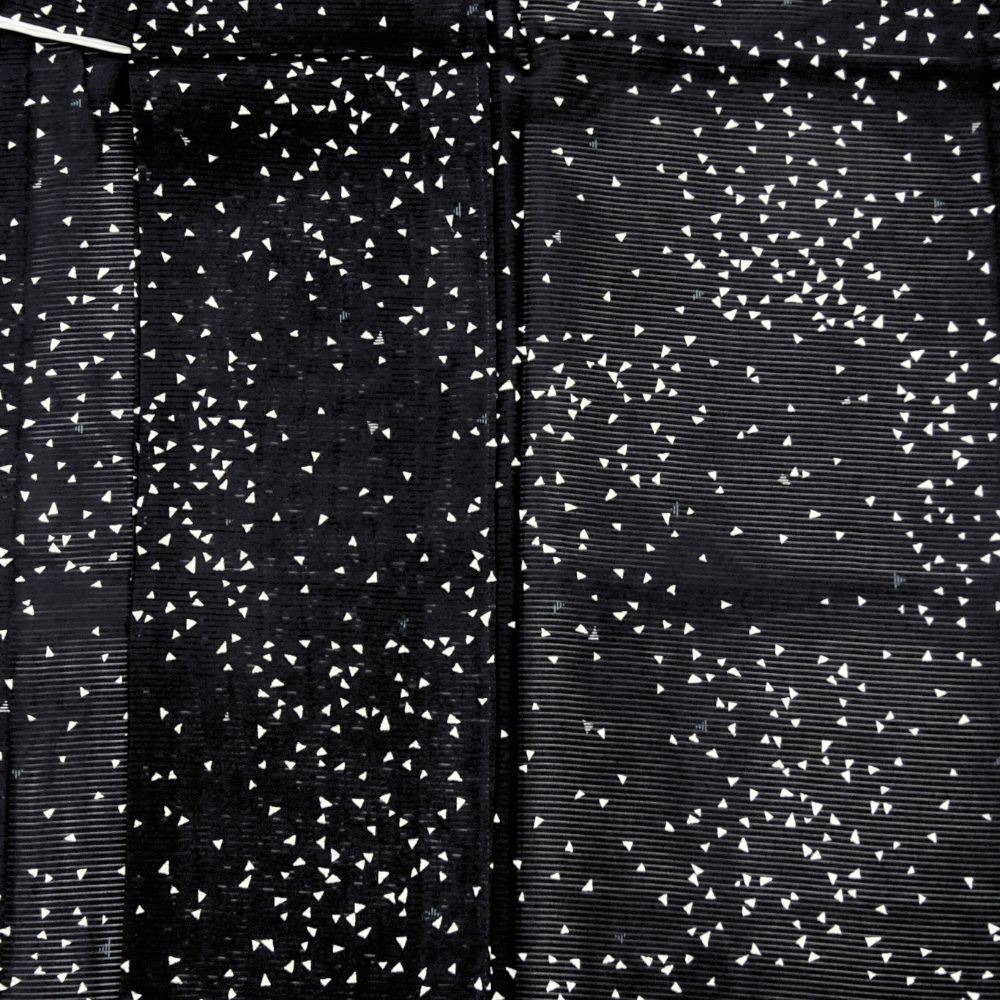 深く落ち着いた黒の地に、小さな三角形の幾何学モチーフがリズミカルに散らされた、現代的で洗練されたデザイン。
