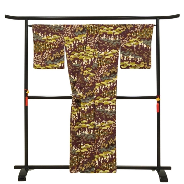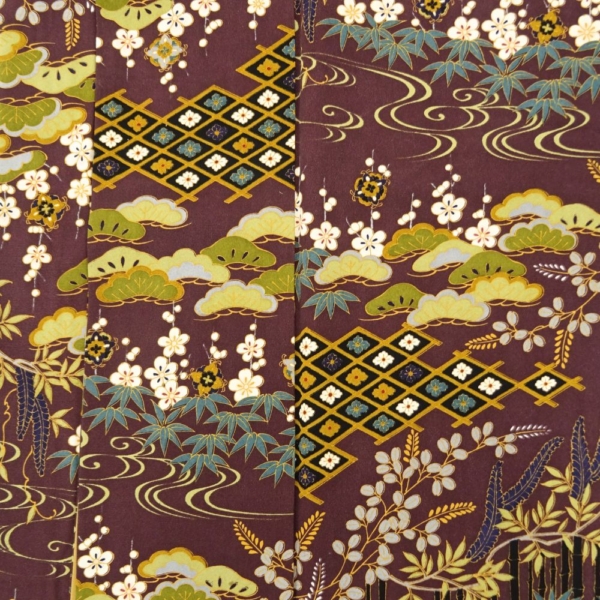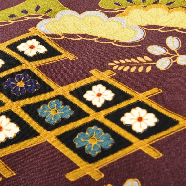 深みのある濃茶に近い暗めの紫の地色に、日本の伝統的な吉祥文様が贅沢に配された、非常に華やかな小紋です。