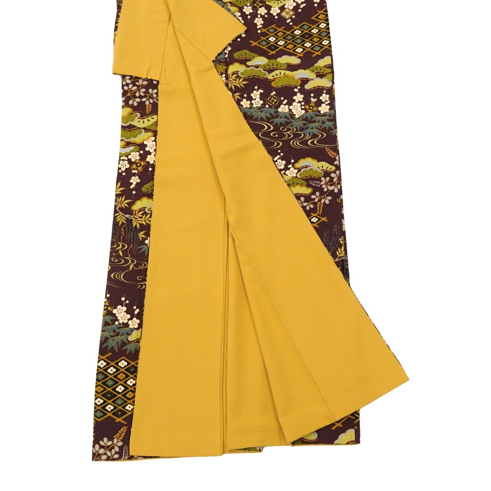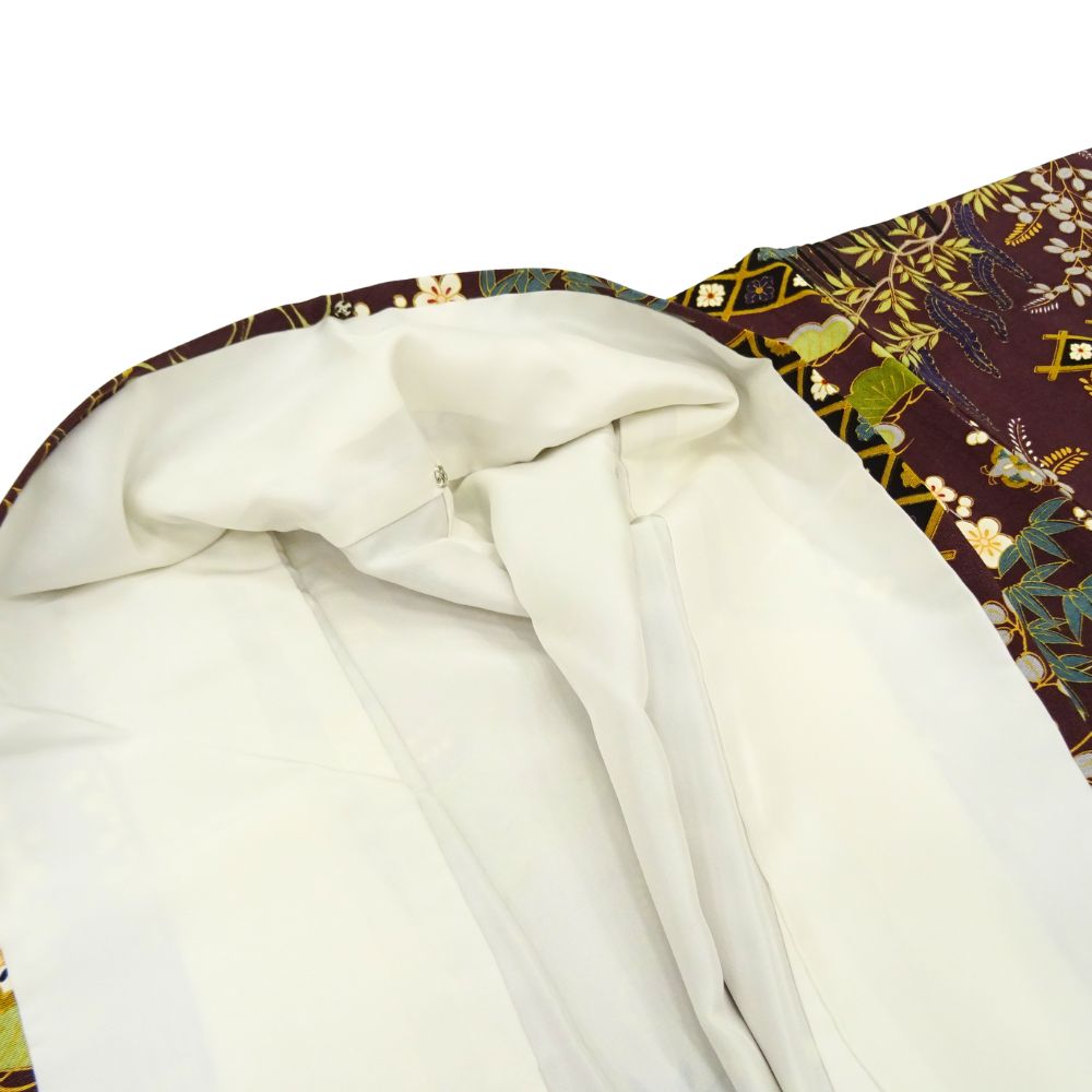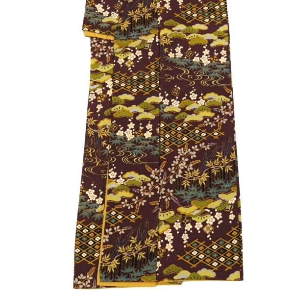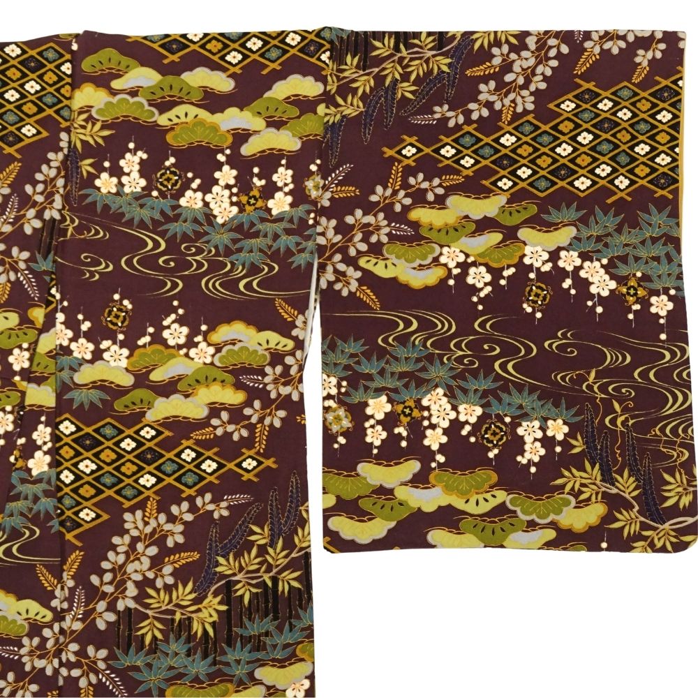 小紋 正絹 リユース 中古 袷 濃茶/紫 松竹梅 桜 流水 8001-20 モダン 上品 観劇 お食事会 お稽古に