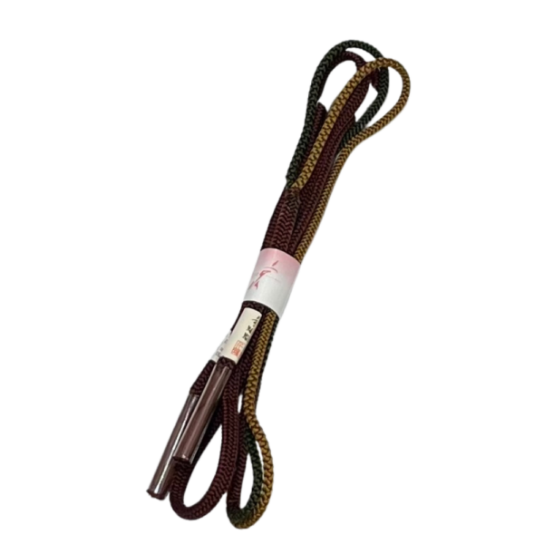 帯締めは、ボルドー・モスグリーン・マスタードの3色で組み上げられた、表情豊かな丸組みの帯締めです。