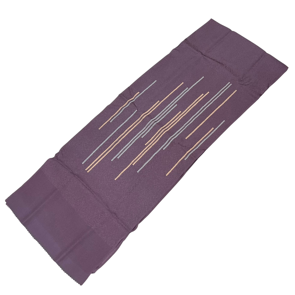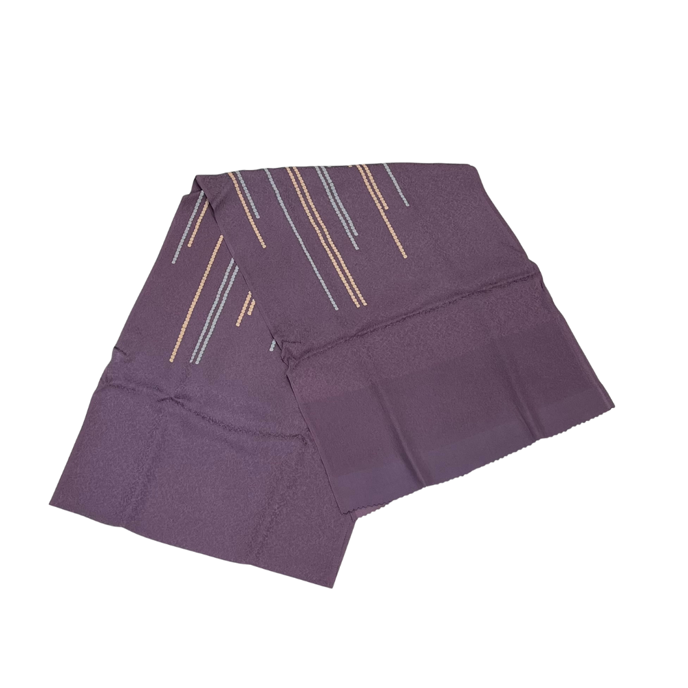 帯揚げは、しっとりと肌馴染みの良い紫色の地に、クリームとグレーのドットで描かれたモダンな幾何学ラインが施されています。