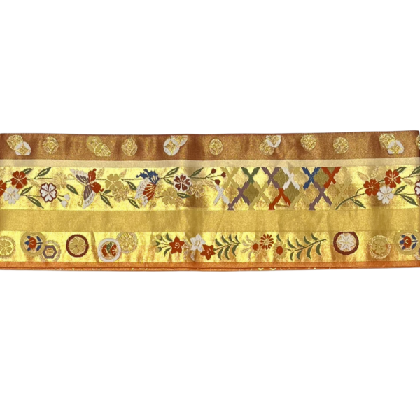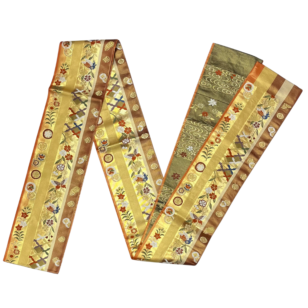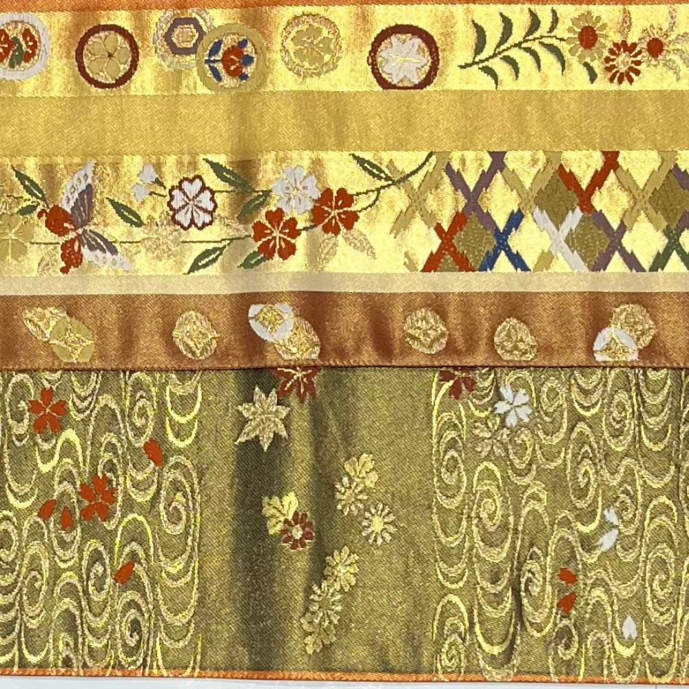 表面は、金地をベースに蝶や桜、撫子などの四季折々の花々と、吉祥文様の七宝や菱紋様が唐織で織り上げられた豪華なデザインです。