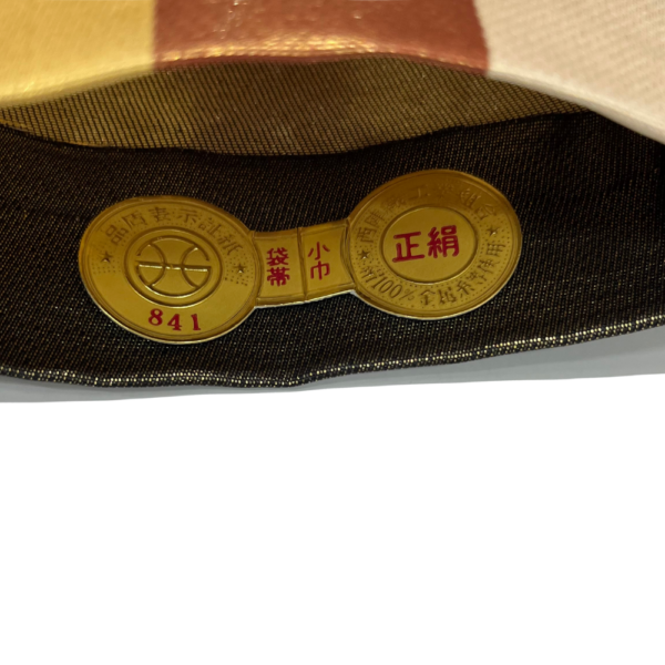 帯の端には、品質を保証する西陣織工業組合の金証紙(No.841)が付属しており、正絹(シルク100%)および金属糸の使用が明記されています。しなやかな締め心地と、光の加減で気品高く輝く金糸の質感は、本物志向の方に最適です。