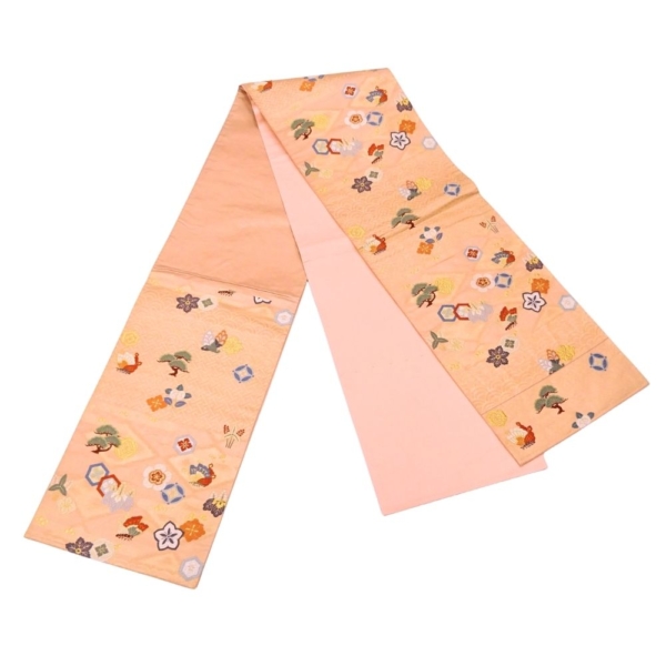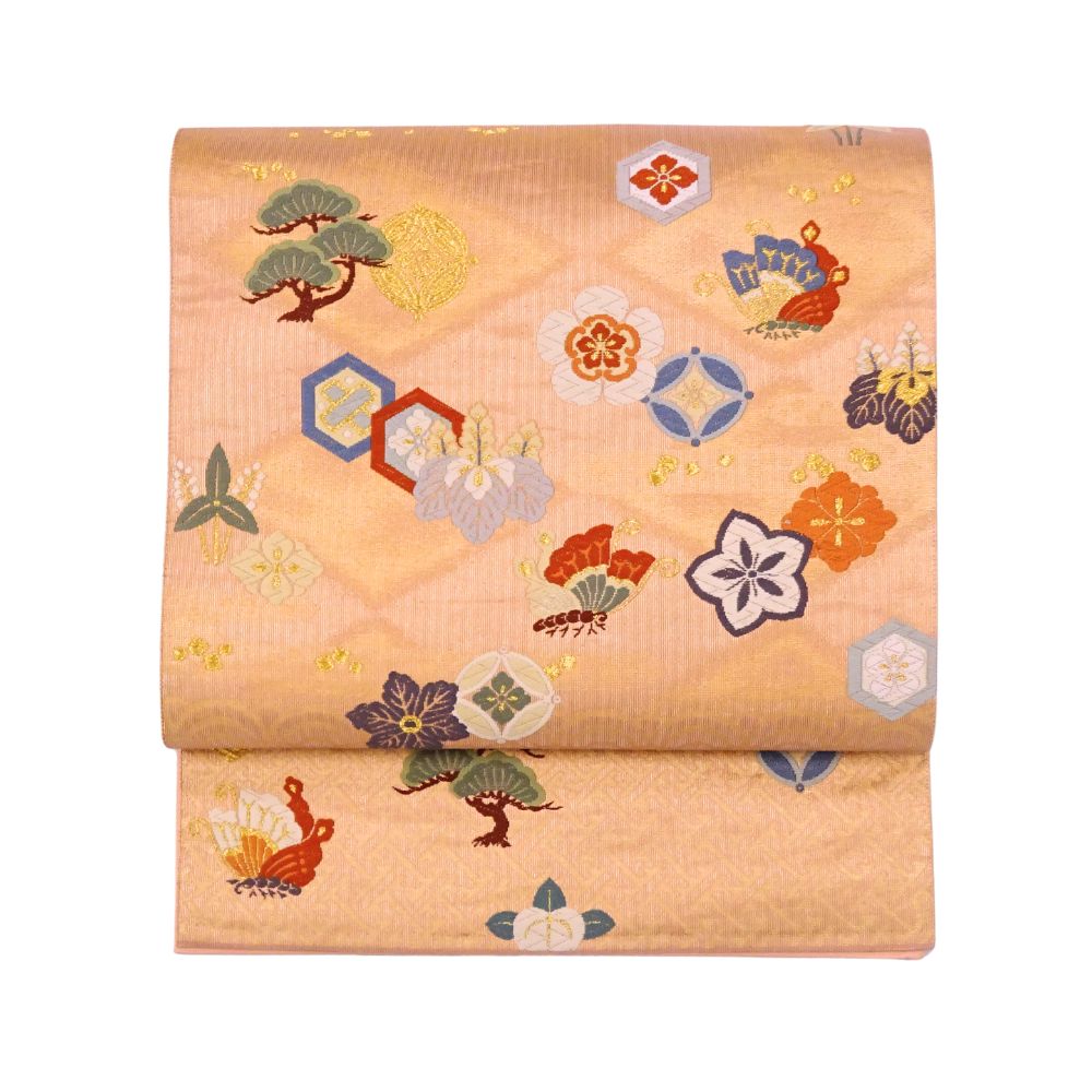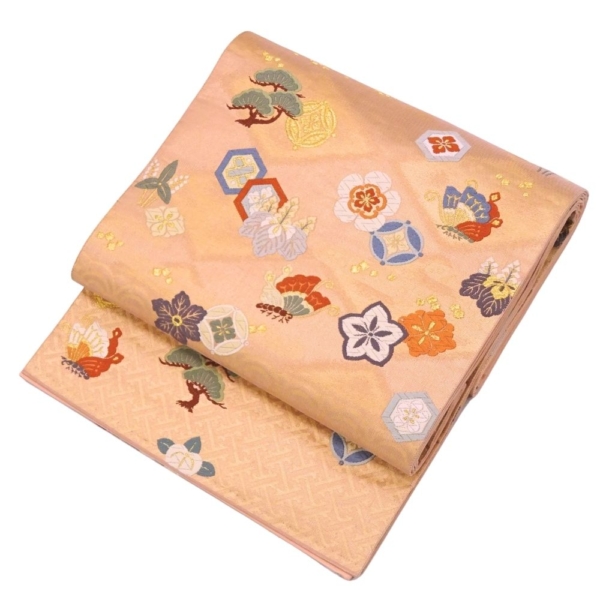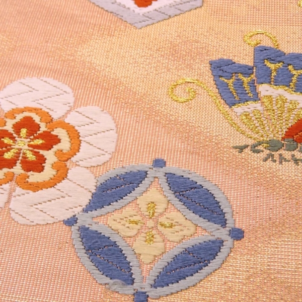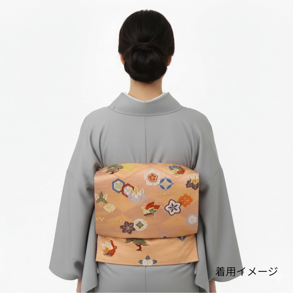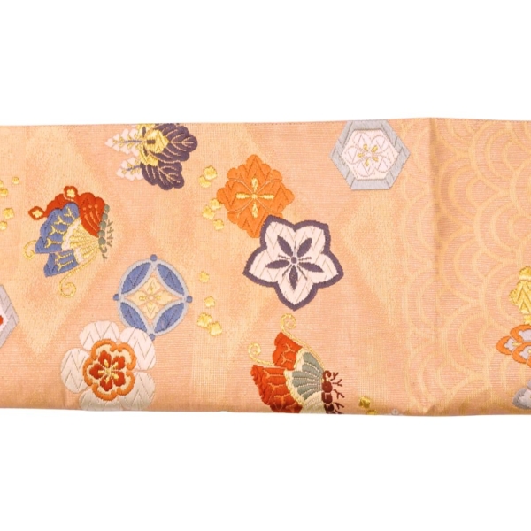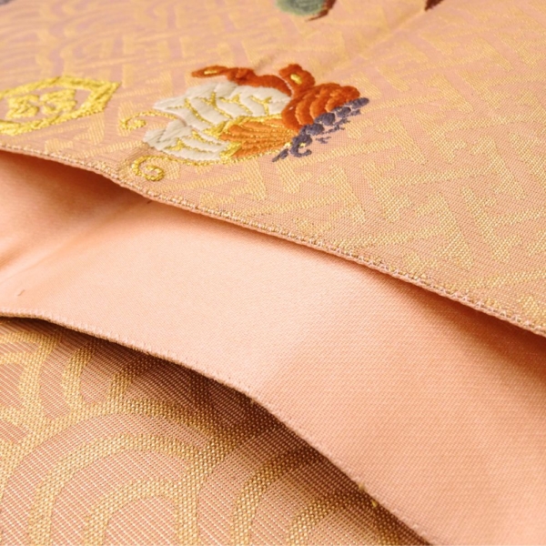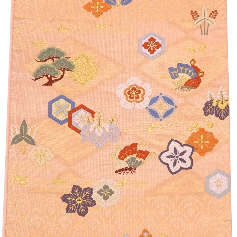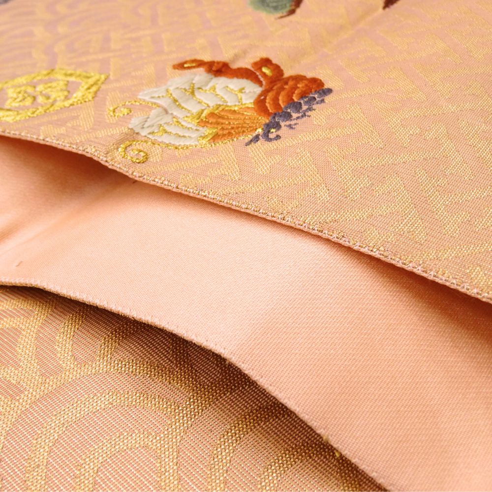 顔映りの良い、温かみのあるサーモンピンクの地に、豪華な金糸とパステルカラーの絹糸で吉祥文様が織り出された正絹の袋帯です 。