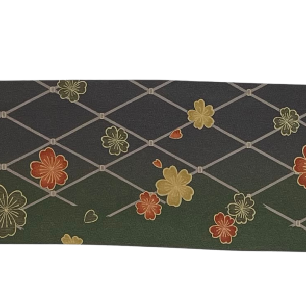 深みのあるモスグリーンからチャコールグレーへと移ろう絶妙なグラデーションに、繊細なラインで描かれた格子と、可憐な桜の花びらが舞うシックなデザインです。