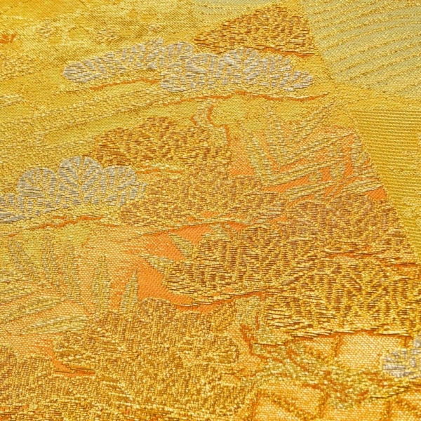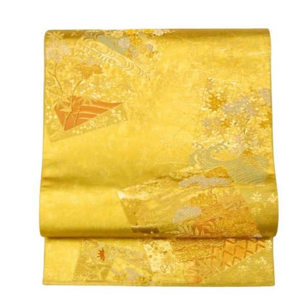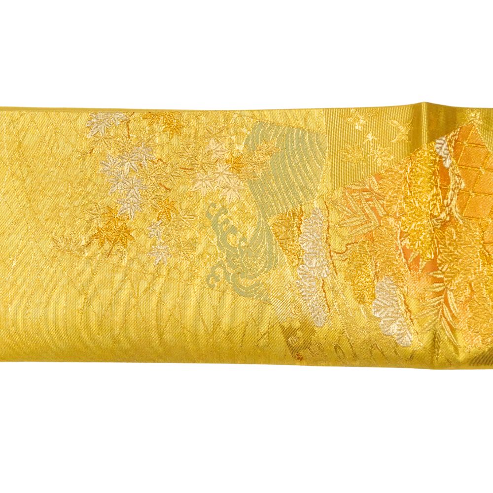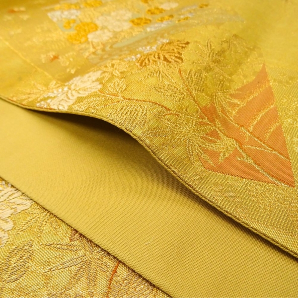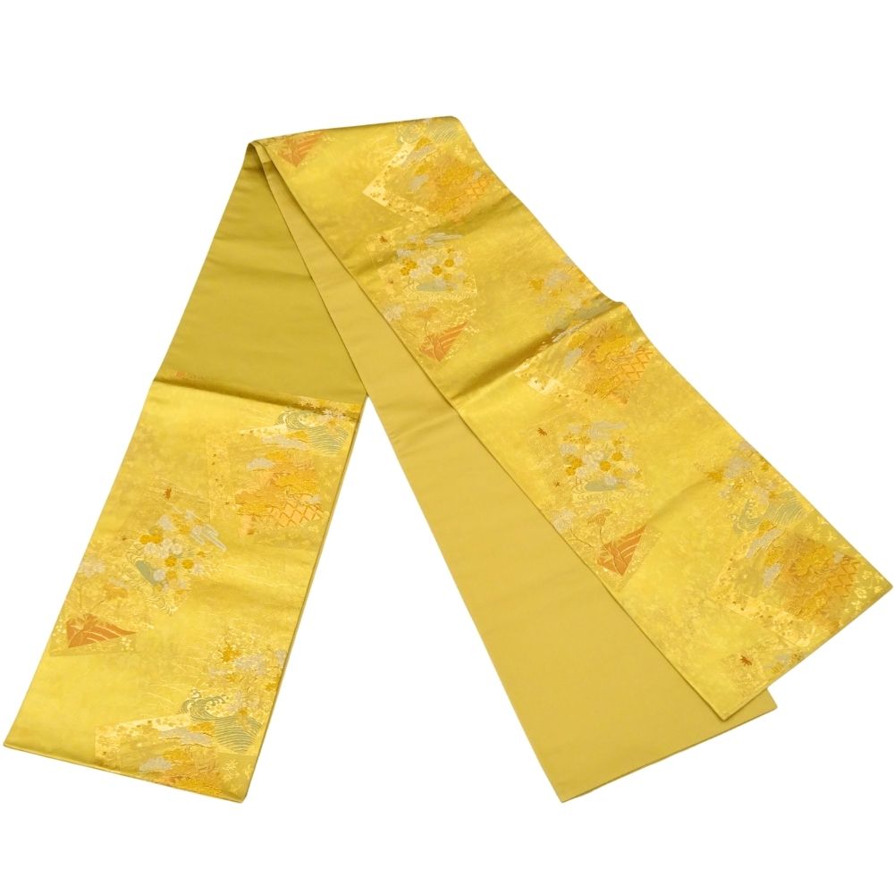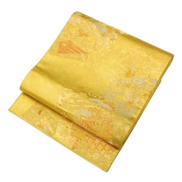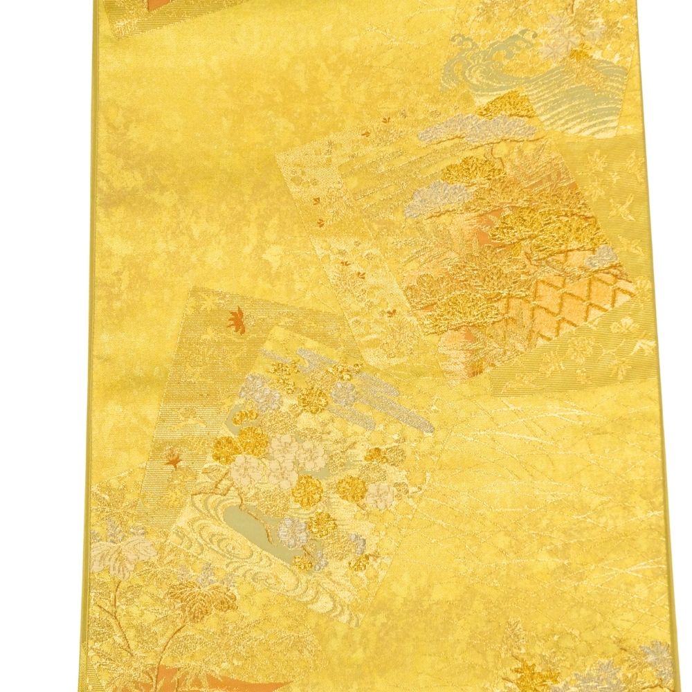 輝きのある鮮やかな金地に、格調高い扇面と四季草花文が施された正絹の袋帯です。